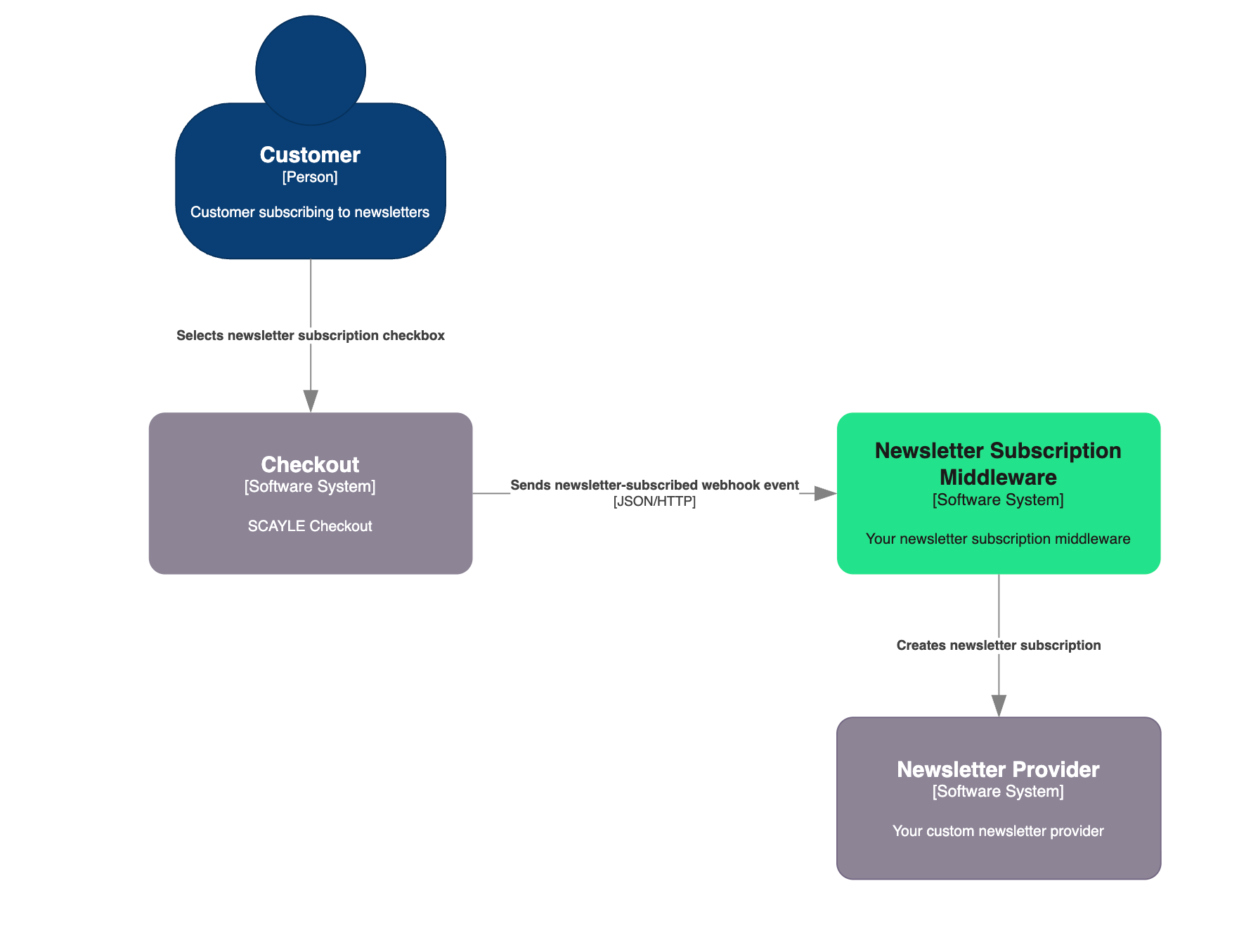 When customers subscribe to newsletters during checkout, checkout will emit a newsletter-subscribed webhook event. This is a POST request to the previously configured endpoint.