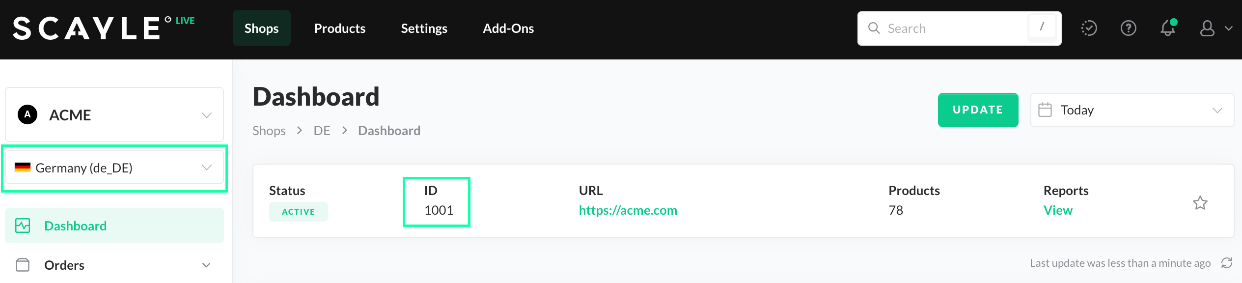 You can find the country ID in the SCAYLE Panel on the Dashboard page of your shop. Ensure the shop country is selected in the dropdown menu (see image below).