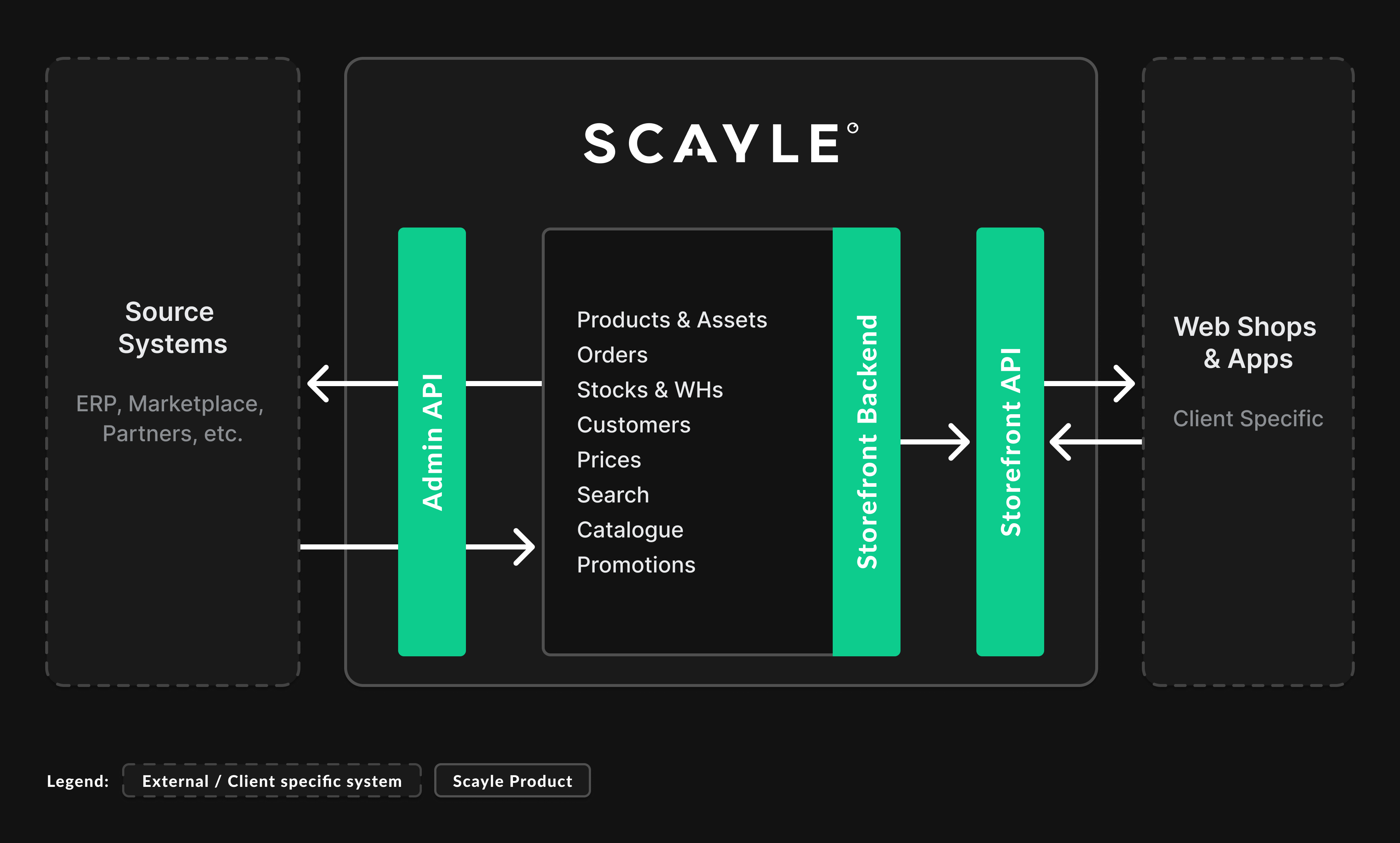 Storefront: the headless storefront that provides design-agnostic business logic and integrations with the SCAYLE backend and a modern e-commerce frontend