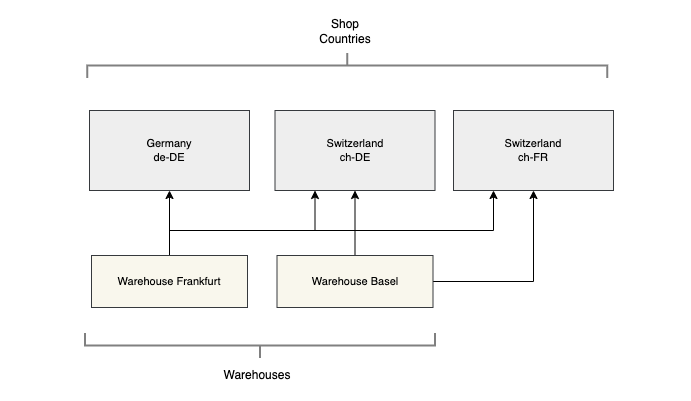 In this situation, we need to create two warehouses. The warehouse in Frankfurt will be assigned to all shop countries, while the warehouse in Basel will only be assigned to the 2 shop countries of Switzerland.