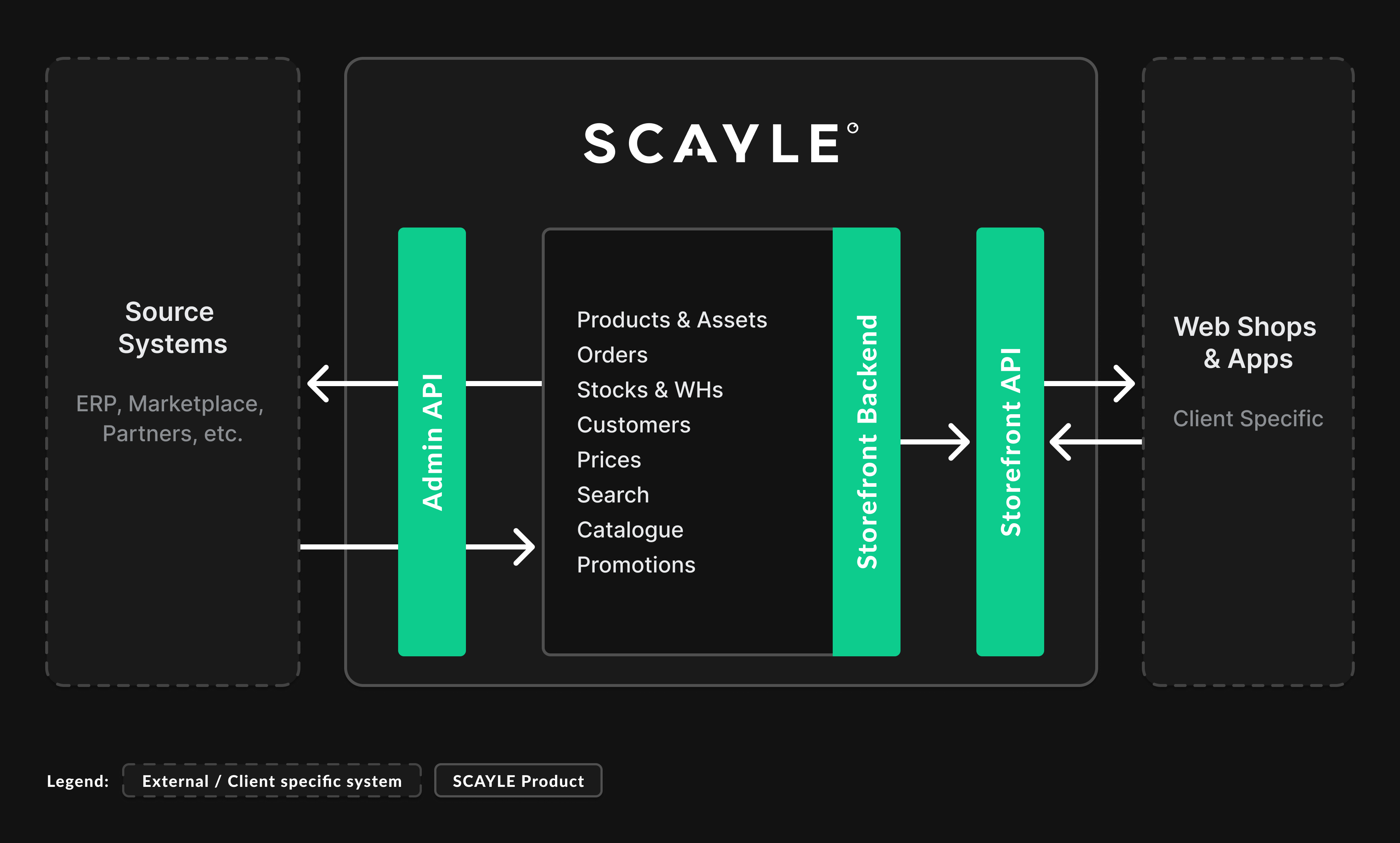 SCAYLE offers two core APIs, the Admin API and the Storefront API, that are used to create and manage data within a shop. In addition, SCAYLE offers the Storefront Application, a highly-customizable template that makes it easy to build a frontend for shops.