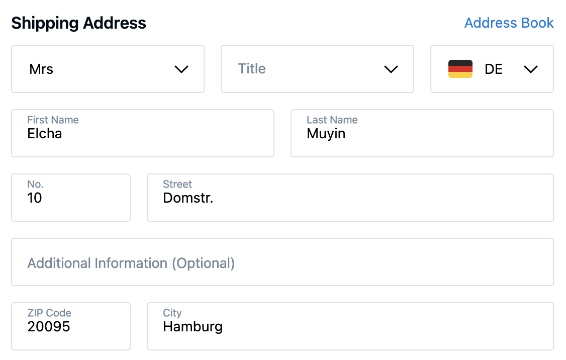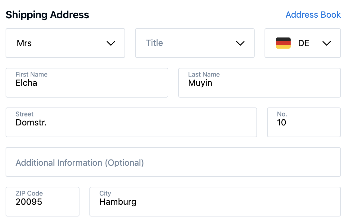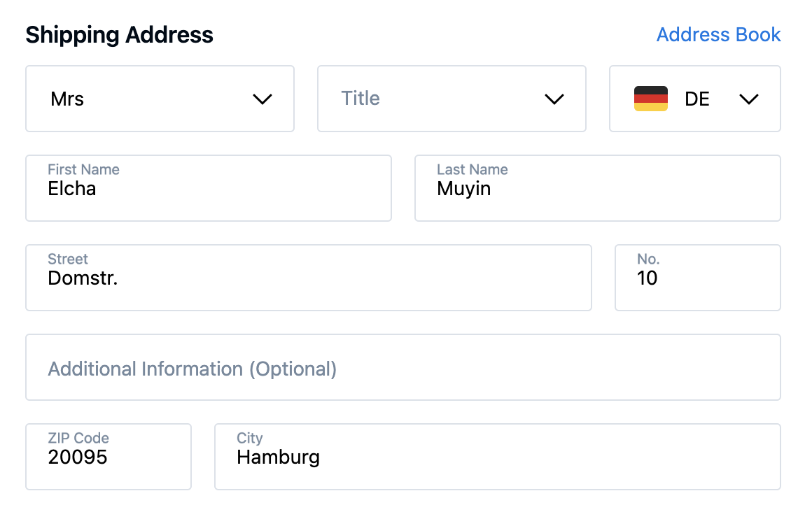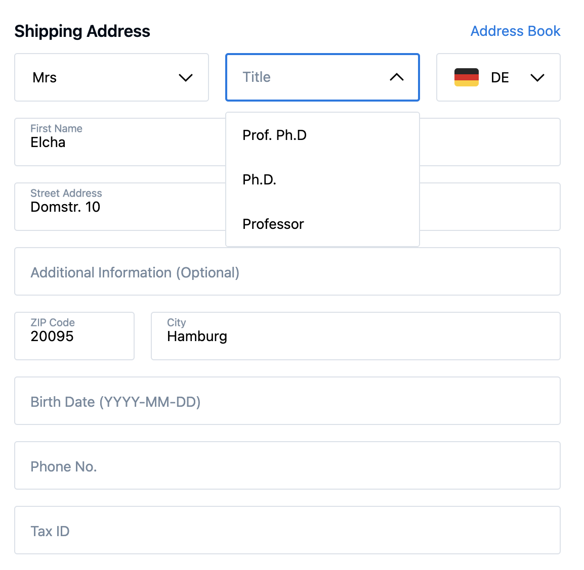 Unlike the "Collection Point" or "Store Pickup" options, Home Delivery necessitates detailed customer address information to ensure successful shipping. SCAYLE’s is offering a customizable address component to capture essential shipping details, including country, street, and house number, as well as additional information such as Tax ID, gender options, and birth date.