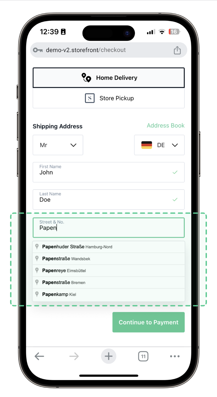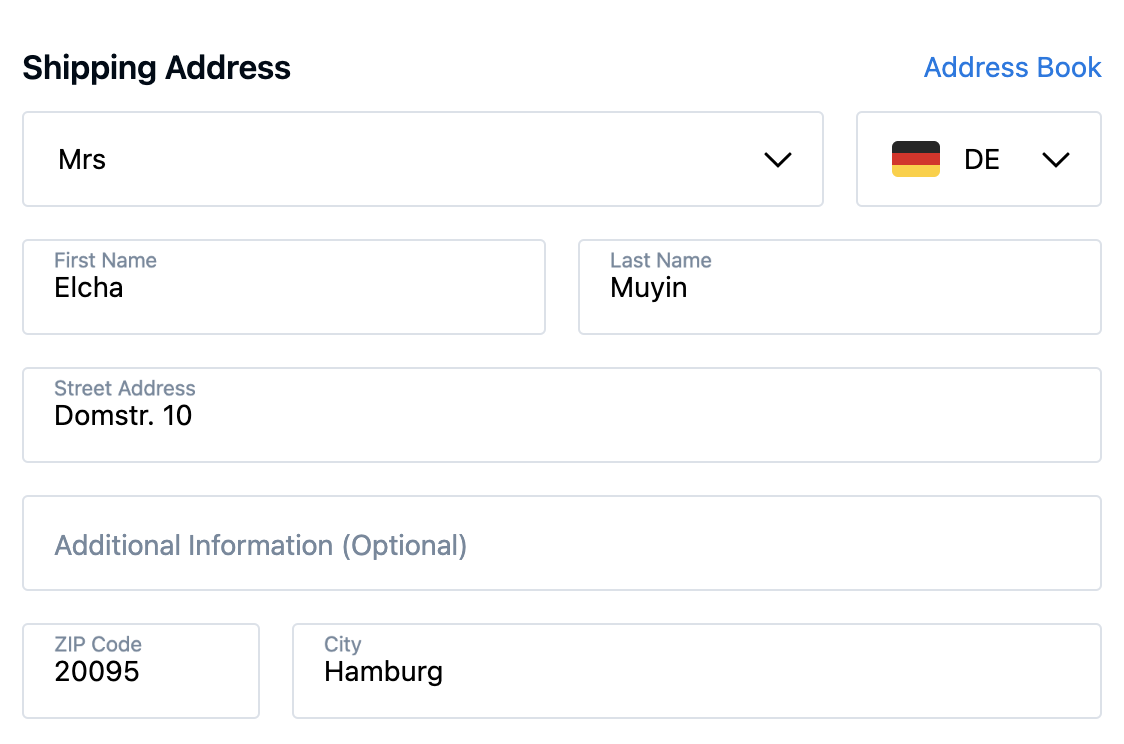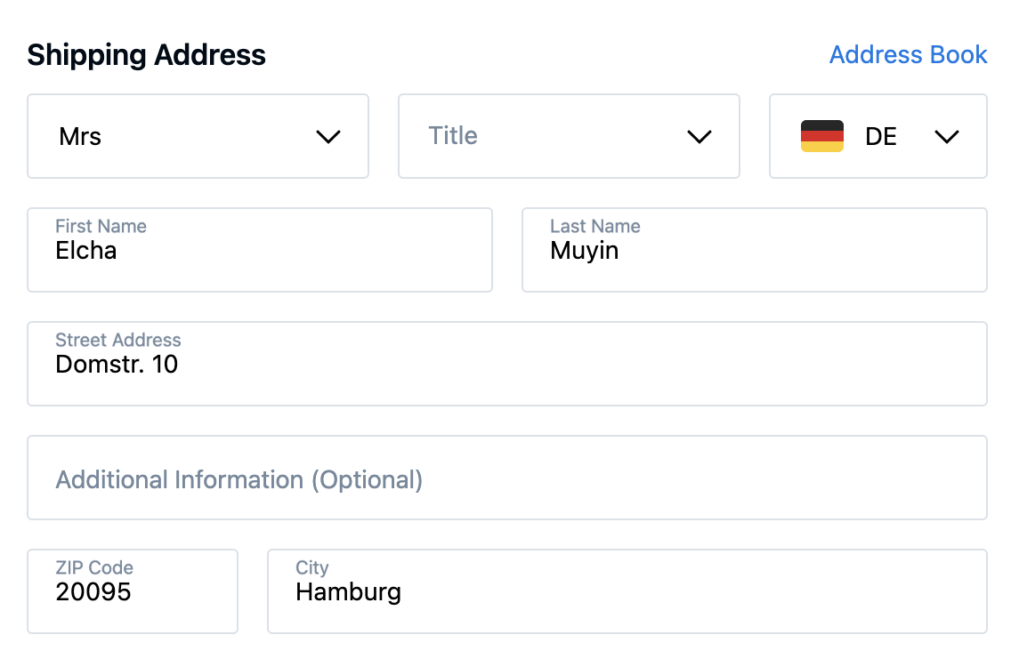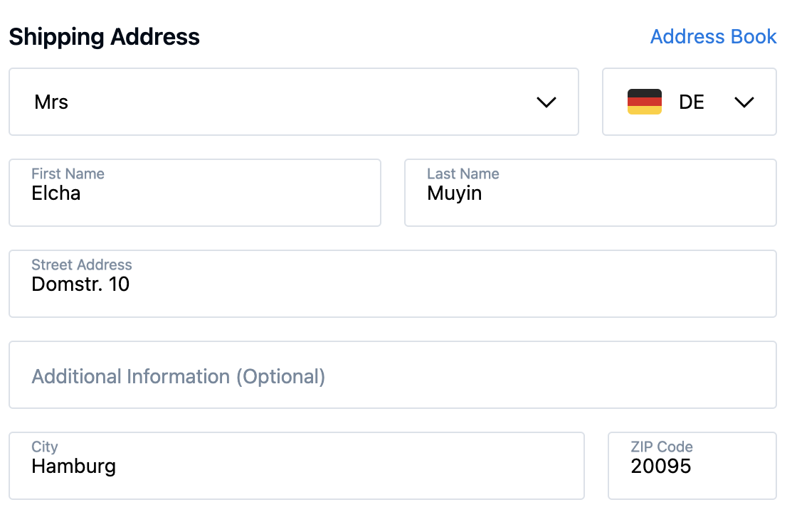 Unlike the "Collection Point" or "Store Pickup" options, Home Delivery necessitates detailed customer address information to ensure successful shipping. SCAYLE’s is offering a customizable address component to capture essential shipping details, including country, street, and house number, as well as additional information such as Tax ID, gender options, and birth date.