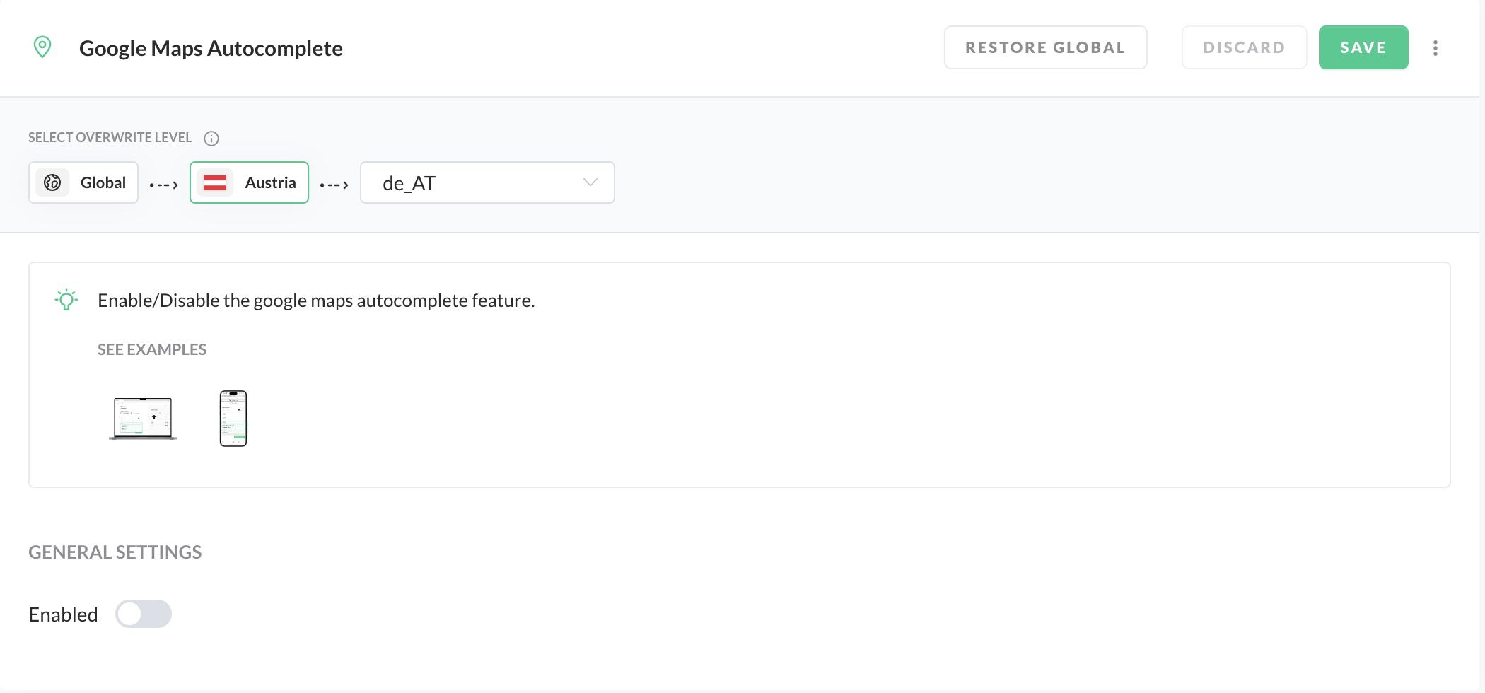 Navigate to Settings ➜ Checkout ➜ Configurations ➜ Address Form ➜ Google Maps Autocomplete