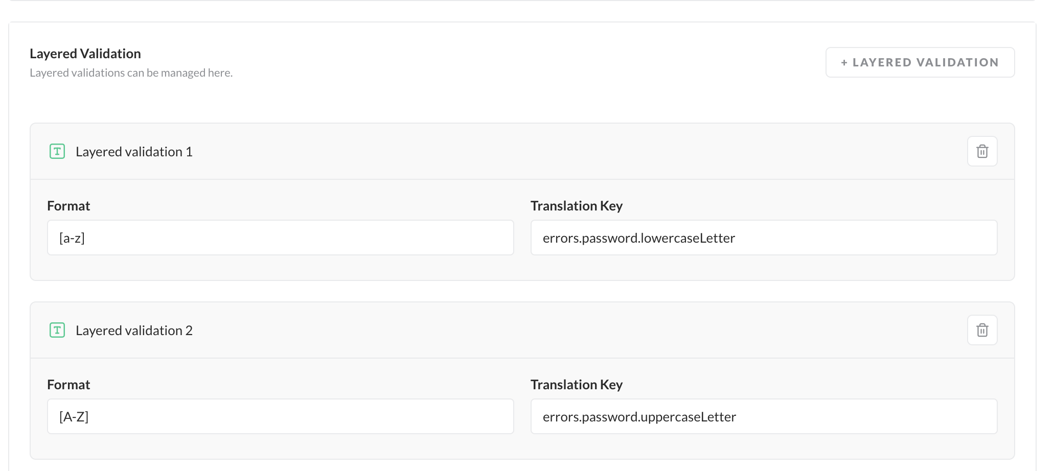 On top of the default validators, each country can have it's own country-specific validator, that overwrites the default one. As an example, zip-code field for Austria has a custom validator that overwrites the "zipc-ode" format by providing an explicit Regex format, against which all values are validated.