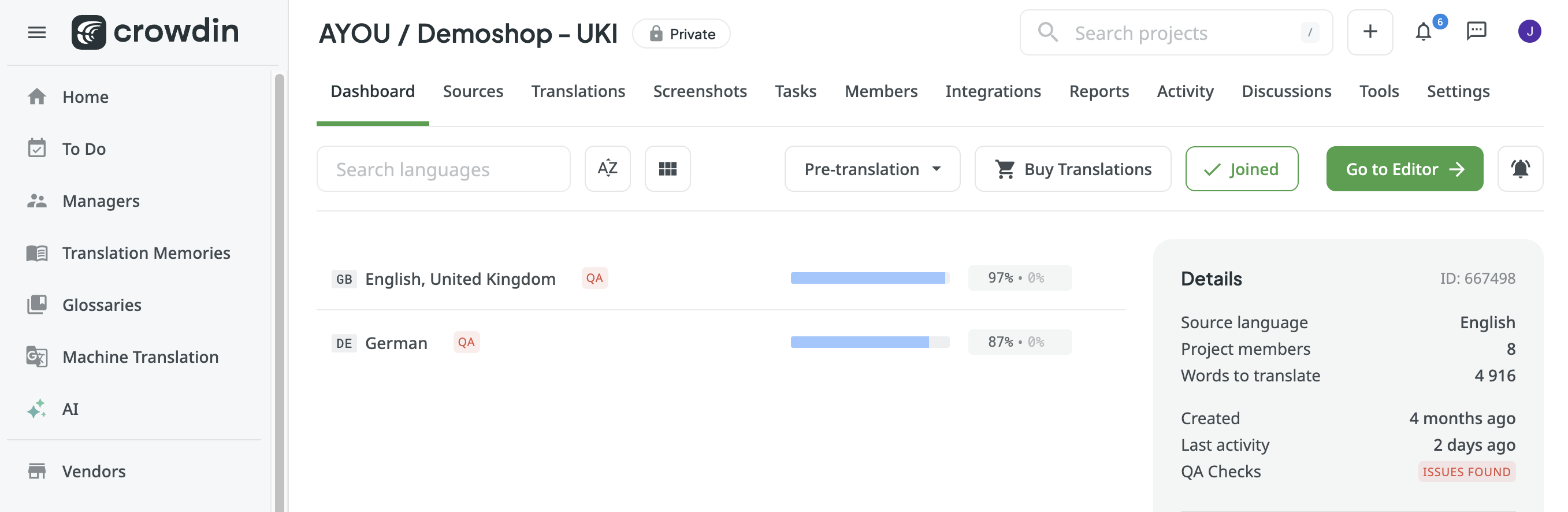- Once logged in to Crowdin, select a language in your project, in this example English, United Kingdom