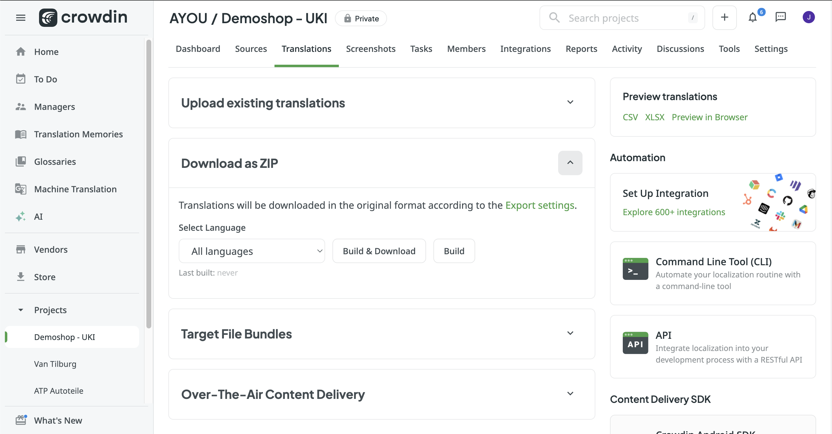 You will get the URL and access rights to Crowdin from your SCAYLE Account Manager. The project includes pre-configured standard keys in the default language (EN).