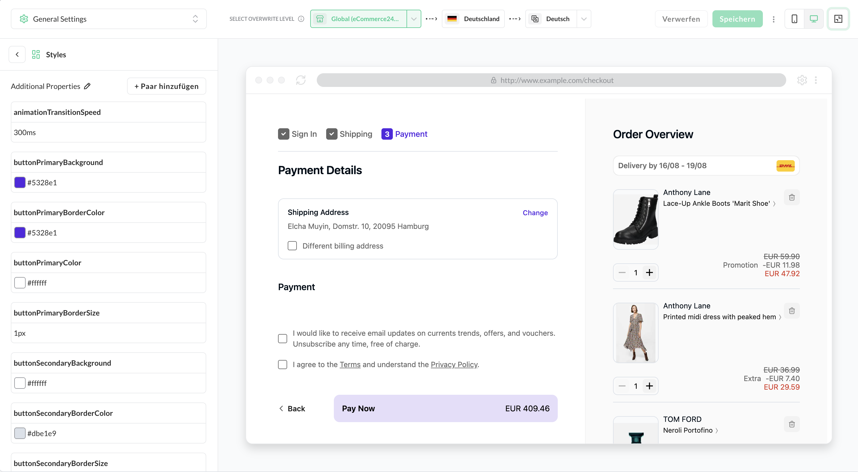 Our SCAYLE Panel offers a dedicated section related to the theming of the checkout web component. As these values are updated, you will see them reflected in our demo instance in real-time, giving you clear feedback of what you are changing and how the layout is affected.