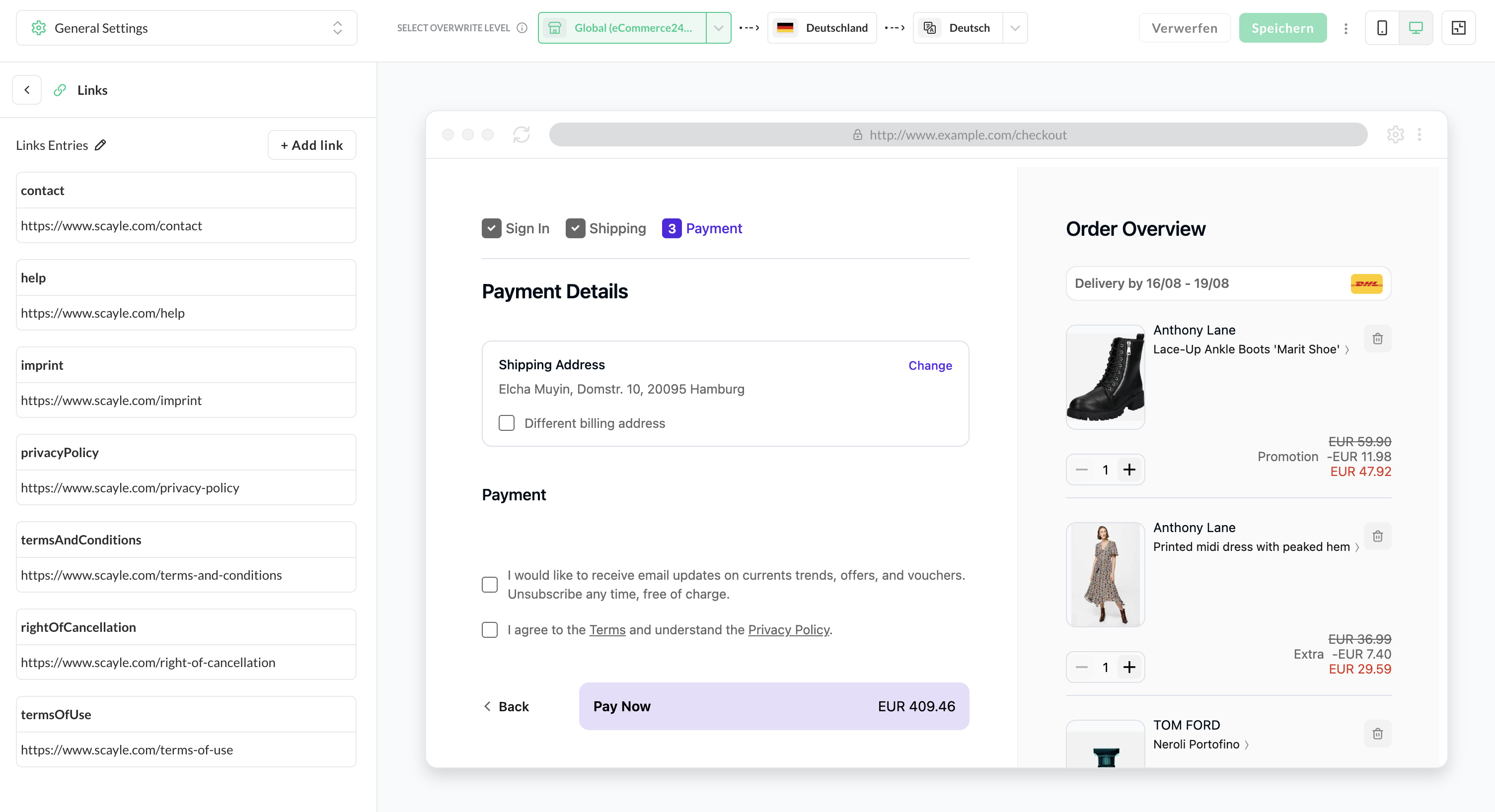 This section specifies common links (e.g., to terms and conditions, privacy policy, etc.) that can be referenced in the translation strings of dynamic checkboxes and texts (see Dynamic Fields).