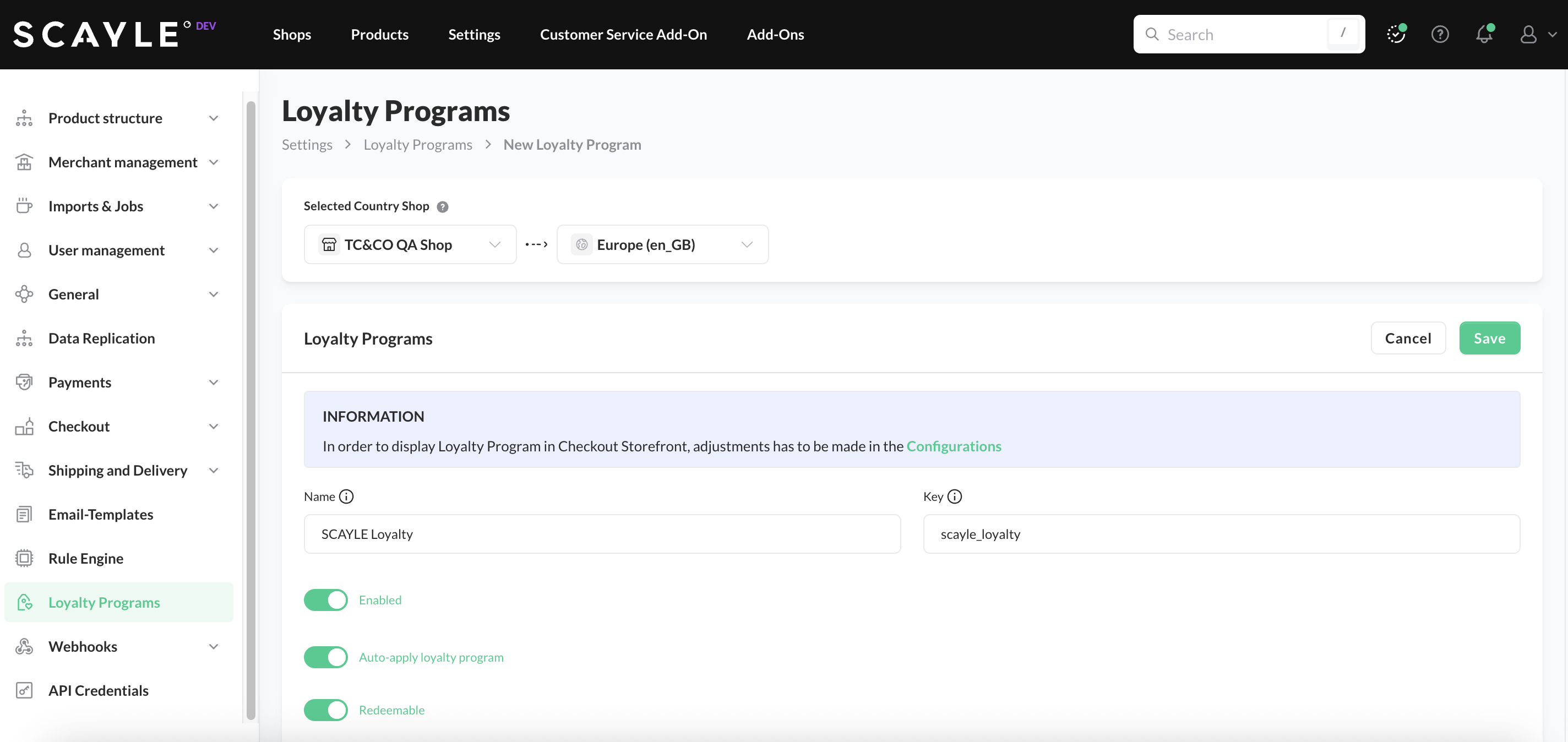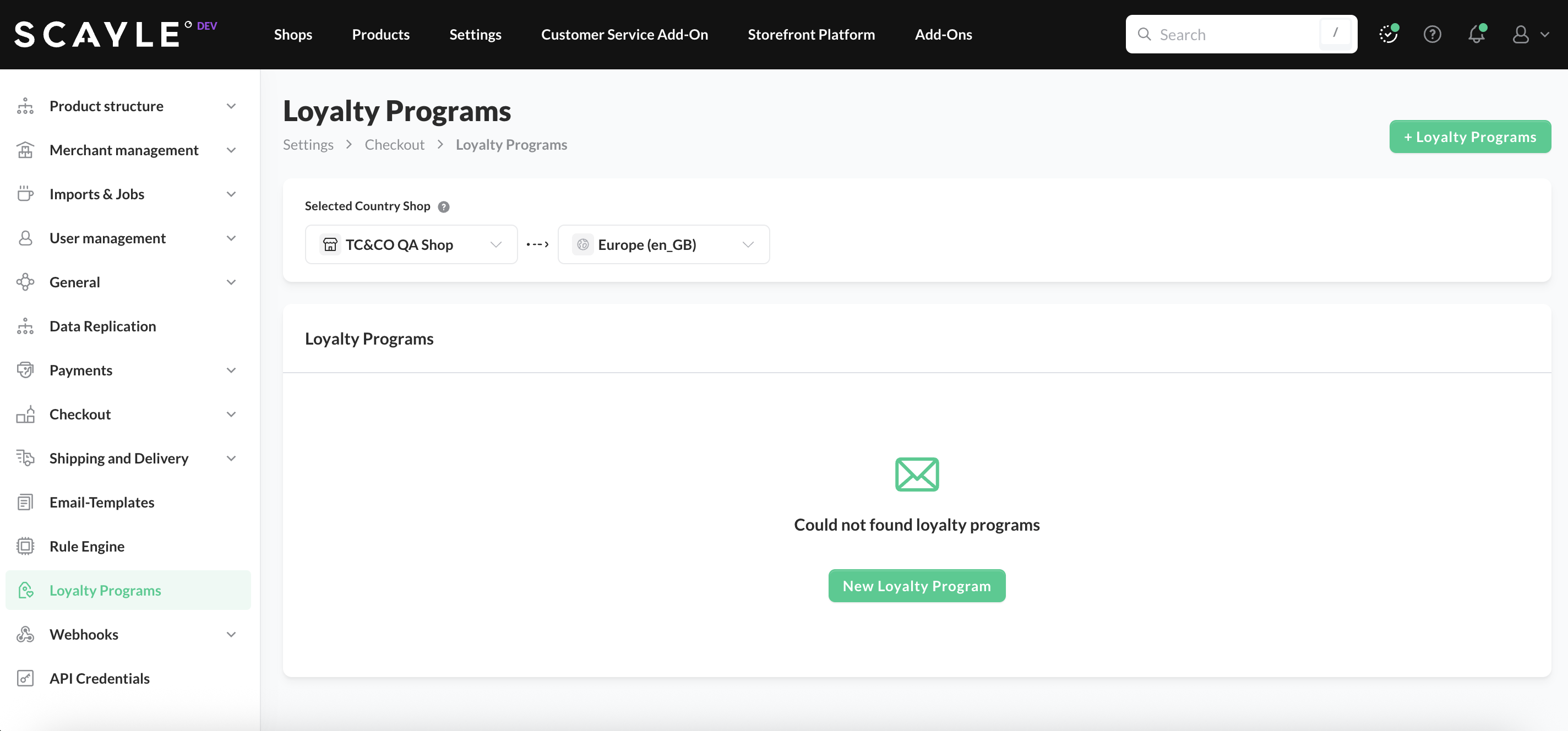 1. In the SCAYLE Panel go to Shops ➜ Storefront ➜ Checkout Settings ➜ Loyalty Programs and create/add a new Loyalty Program:
