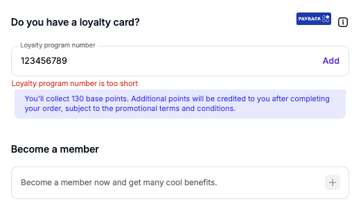 • minLength and maxLength of the loyalty card number input. The checkout uses these values for a basic input validation.