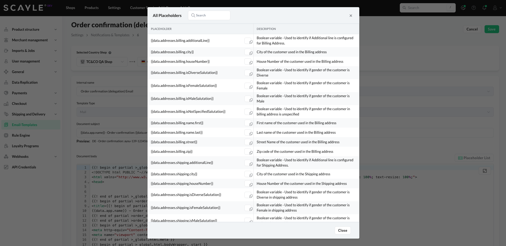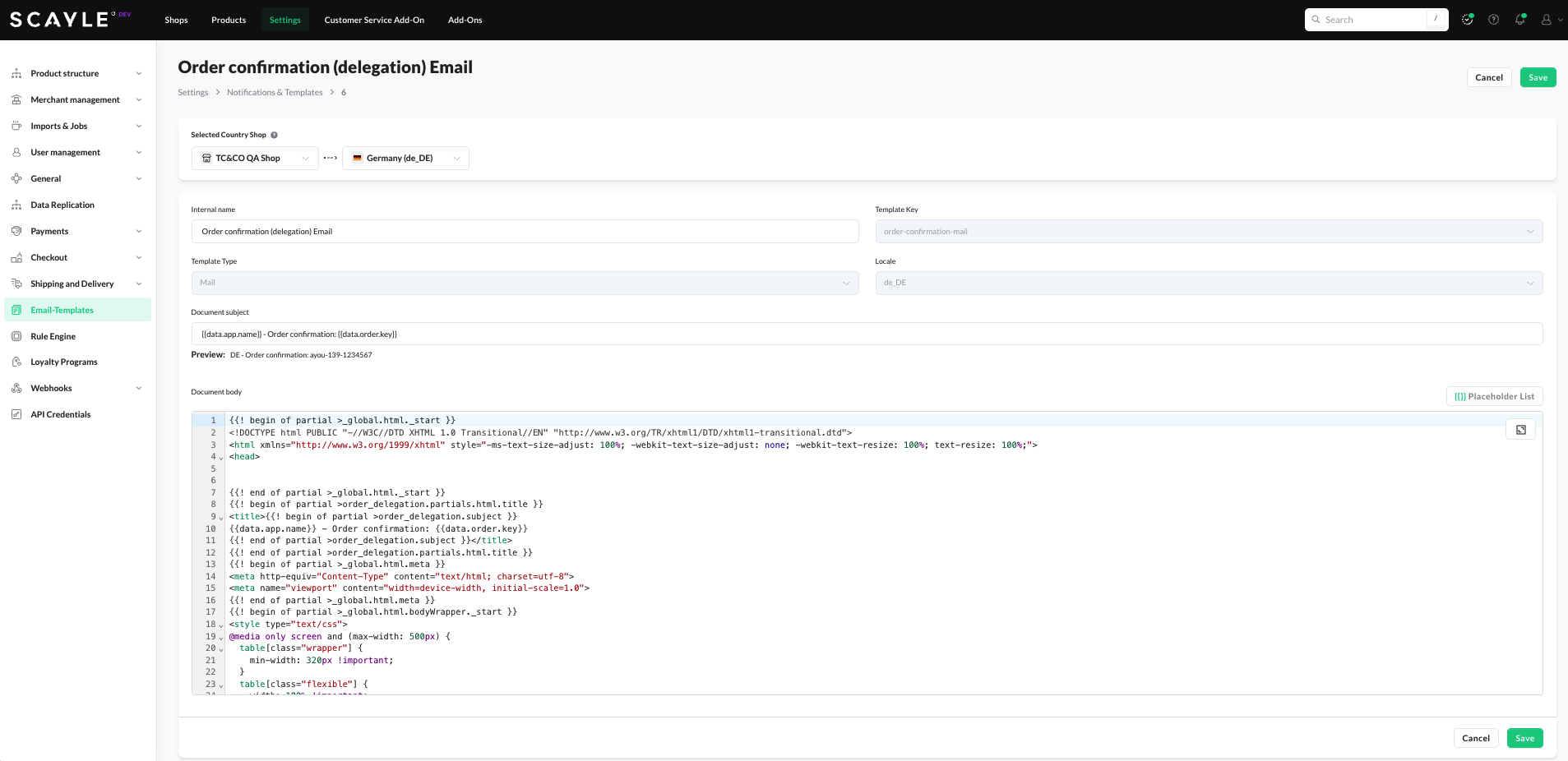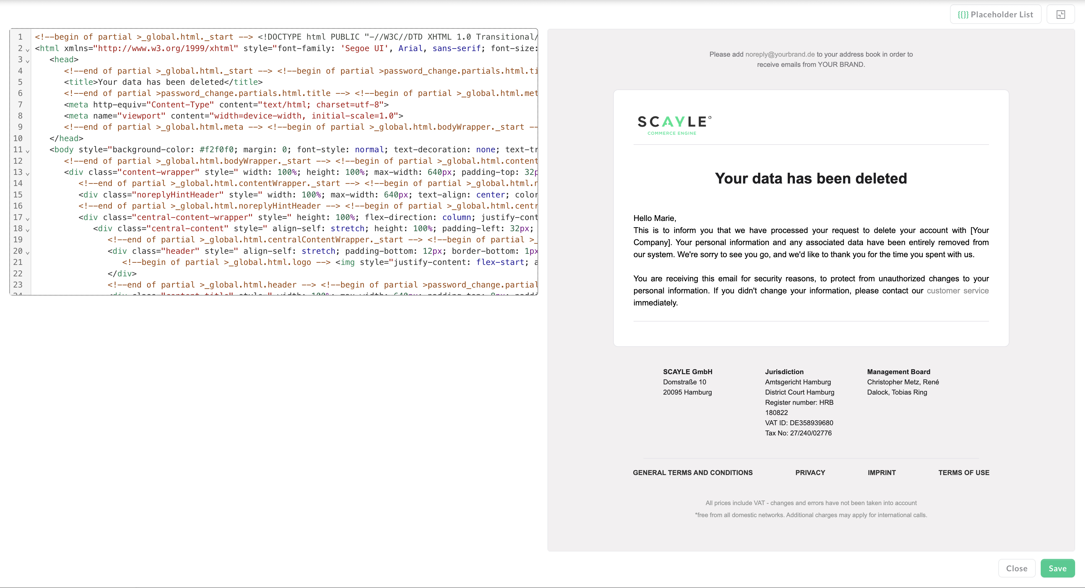 SCAYLE email templates support placeholder variables that allow you to insert dynamic content into your transactional emails. These placeholders are automatically replaced with real data—such as customer names, order numbers, or tracking links—when the email is sent.