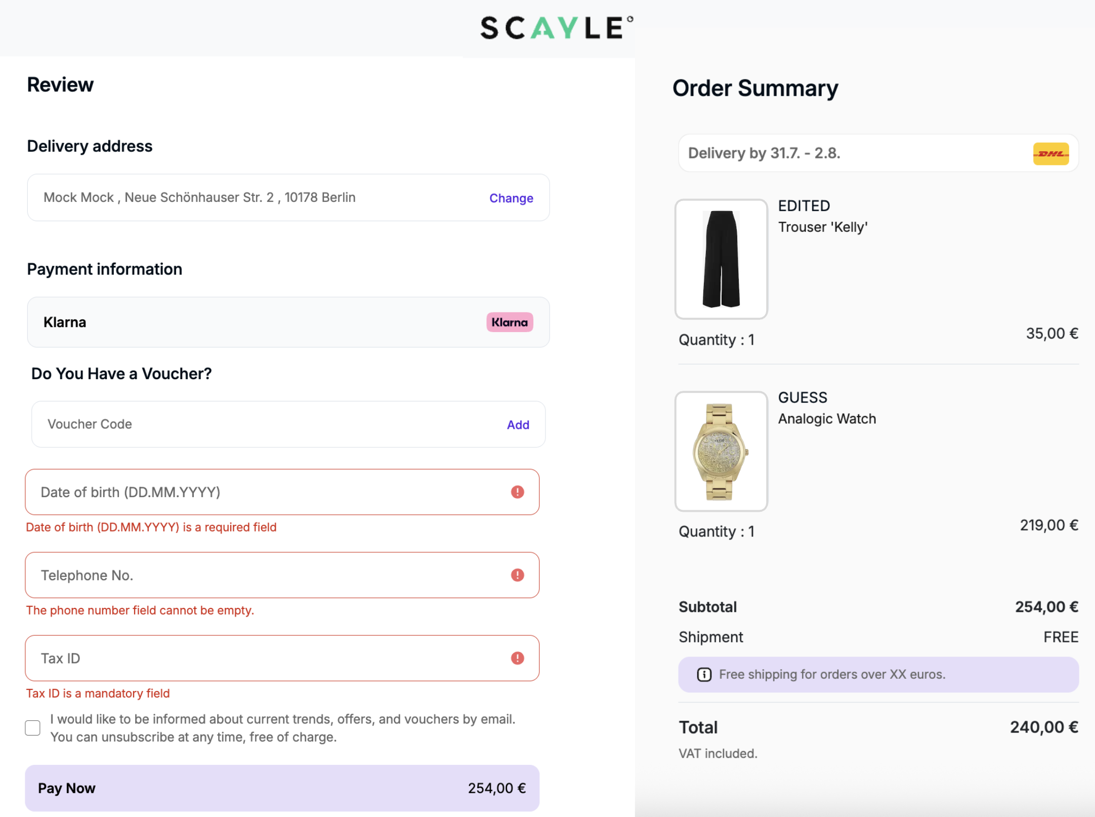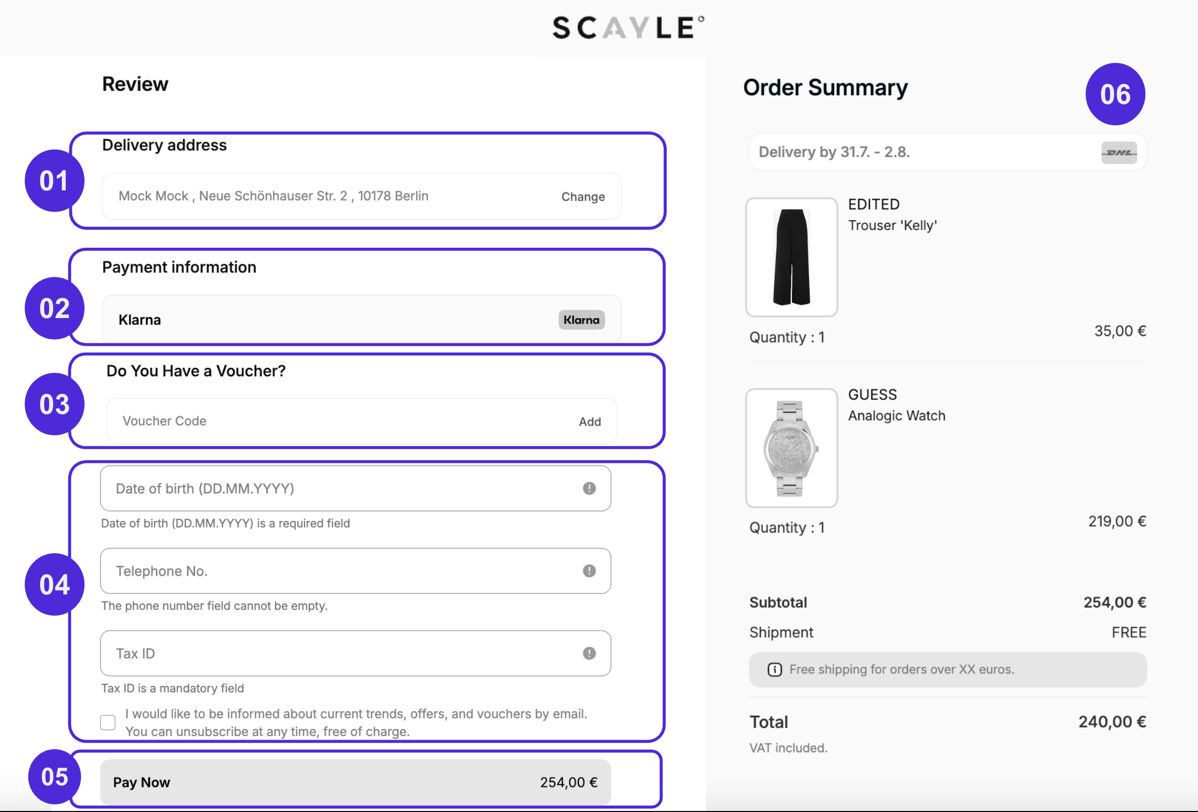 04Dynamic FieldsConfigurable (mandatory/optional)The Order Review Page will always display all enabled dynamic fields configured in the SCAYLE Panel for the shop. If a field is set as mandatory, the information must be filled in before confirming the order.