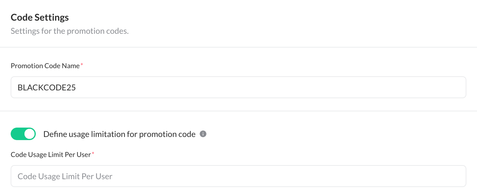 - Code Settings: Set the code name and define a usage limitation per customer if desired