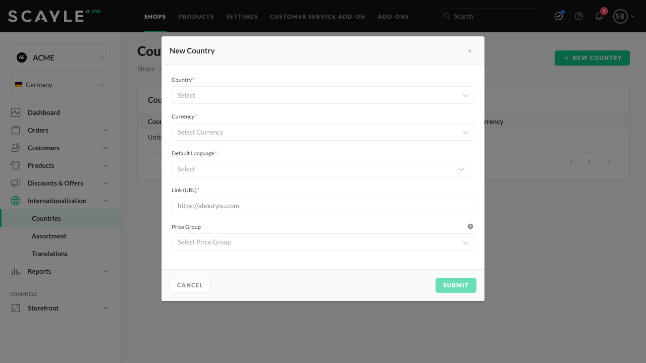 - Navigate to Shops ➜ Internationalization ➜ Countries and click on a Country.