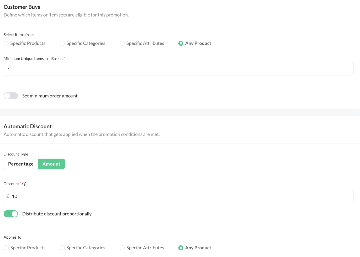 As an example, the following Automatic Discount configuration, if set on Panel, will distribute 10 EUR proportionally to all items which are assigned to a Basket: