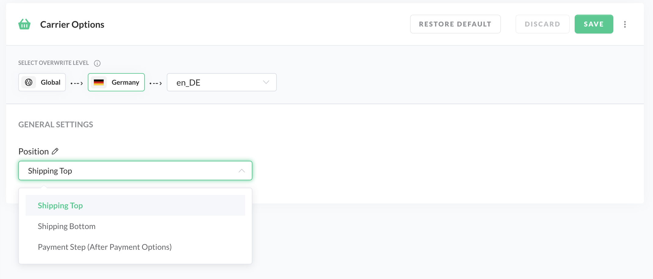 This option can be configured in the SCAYLE Panel under Settings ➜ Checkout ➜ Configurations ➜ Shipment and Delivery ➜ Carrier Options.