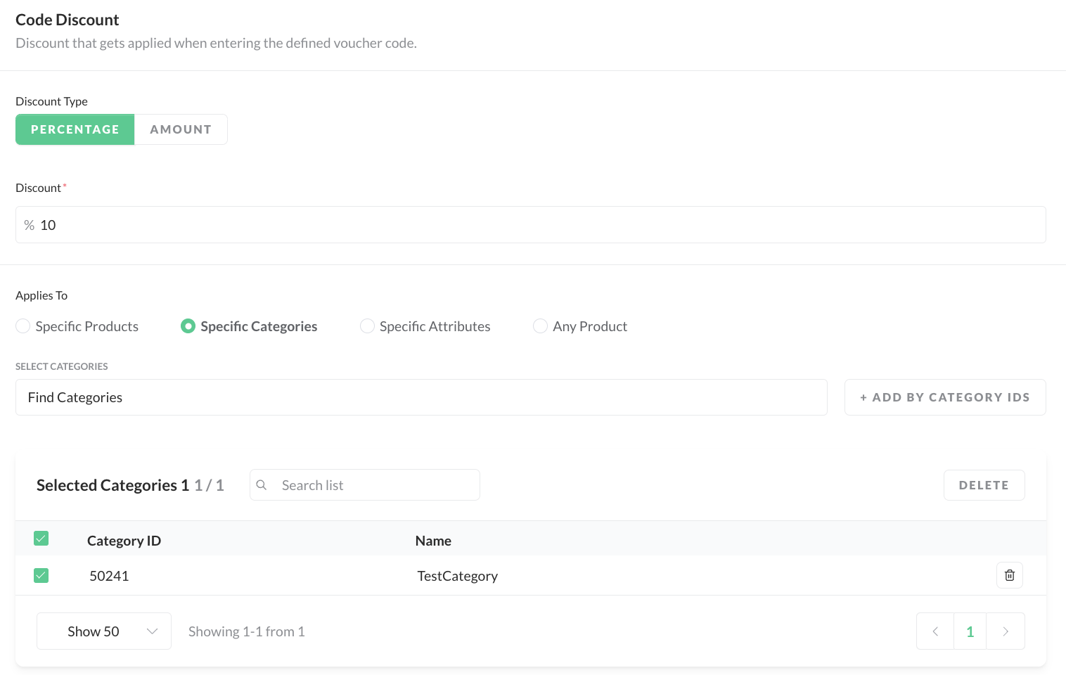 - Amount: a percentage discount amount will be applied to all items where the code applies to