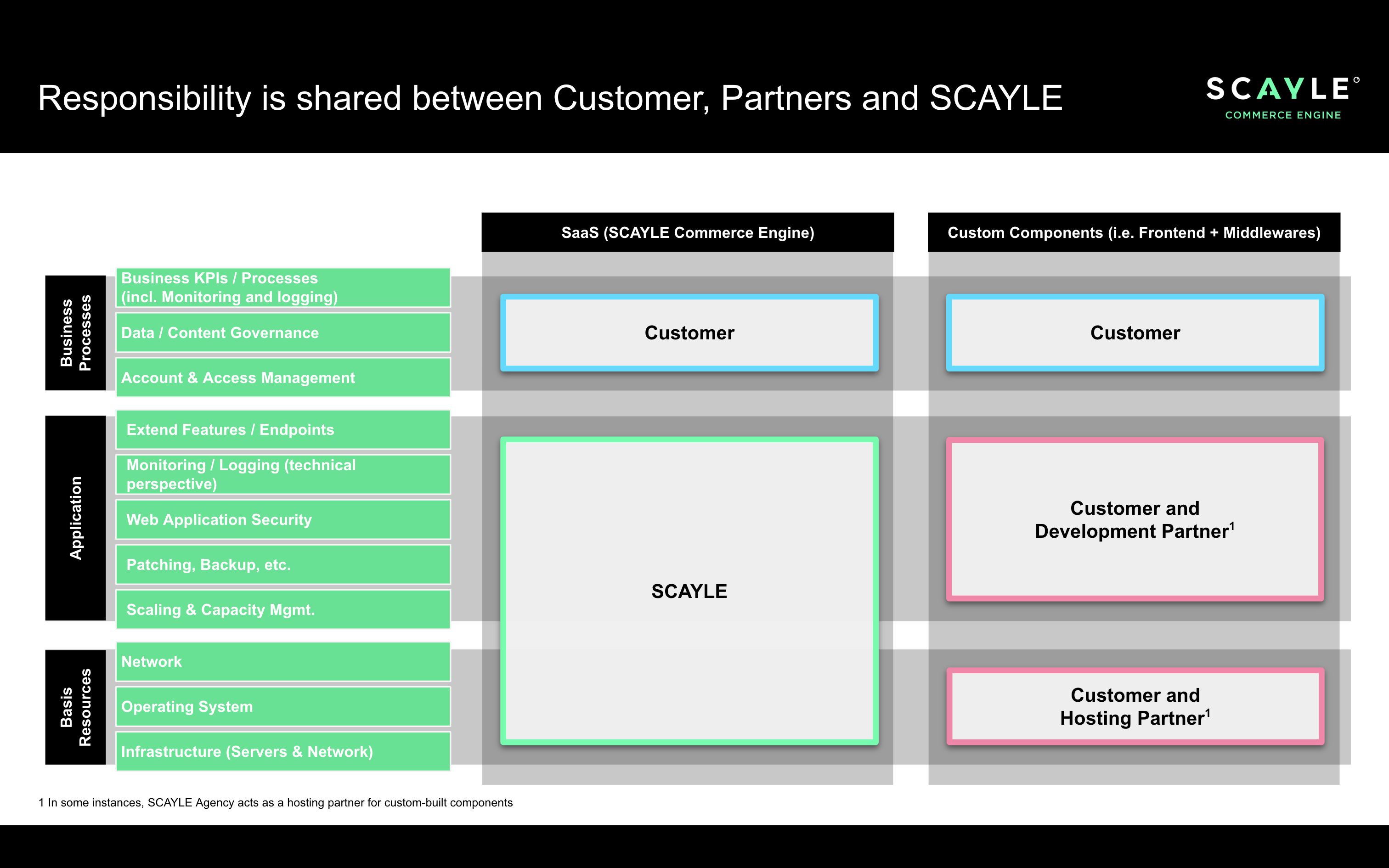 - Secure Configuration: SCAYLE takes responsibility for the secure configuration of the systems maintained by SCAYLE and made available to the tenant. The tenant is responsible for the configuration of the systems connecting to SCAYLE’s API, Checkout configuration, and other shop configurations.