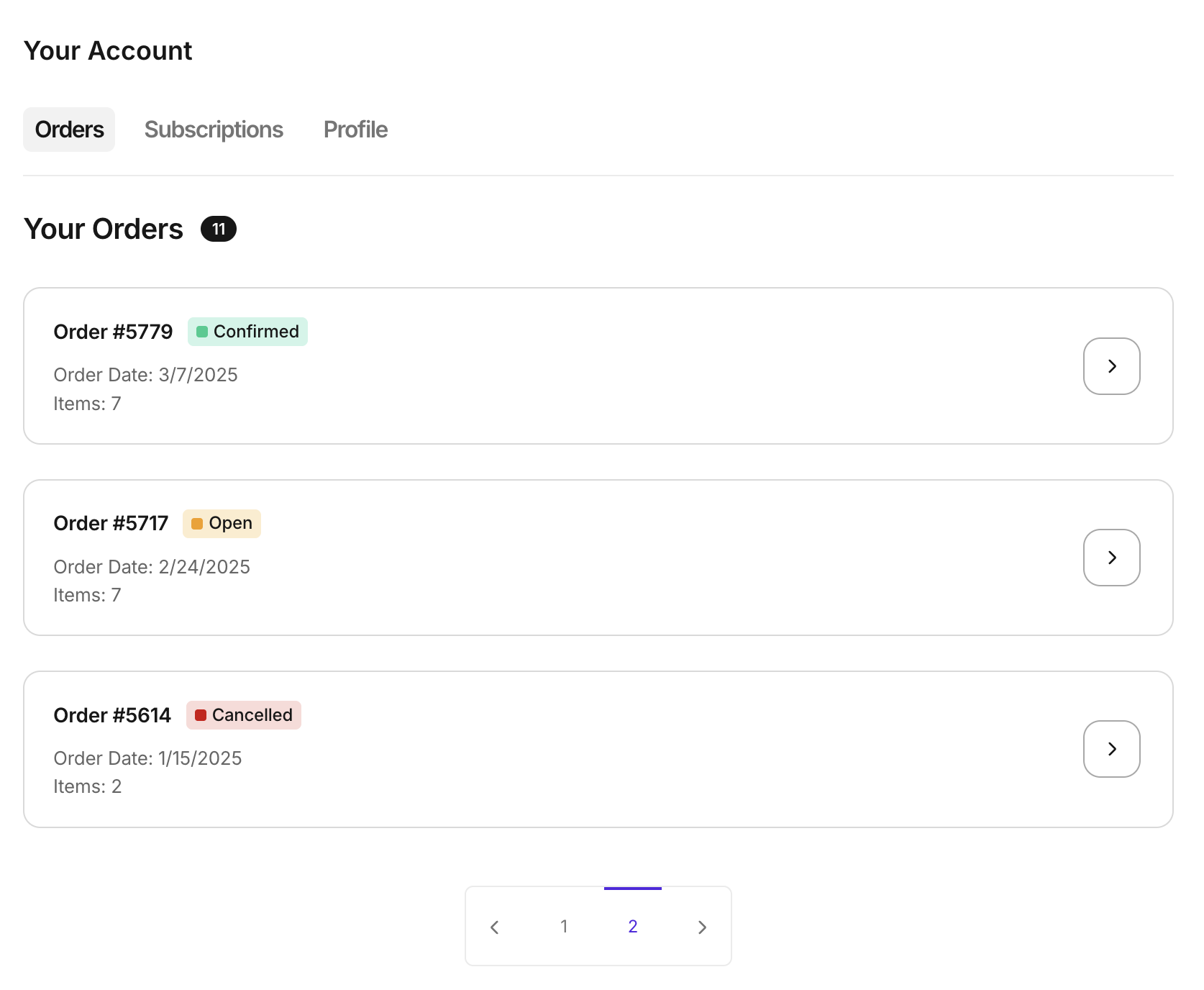 If a user has more than eight orders, a pagination component allows easy navigation through older purchases.