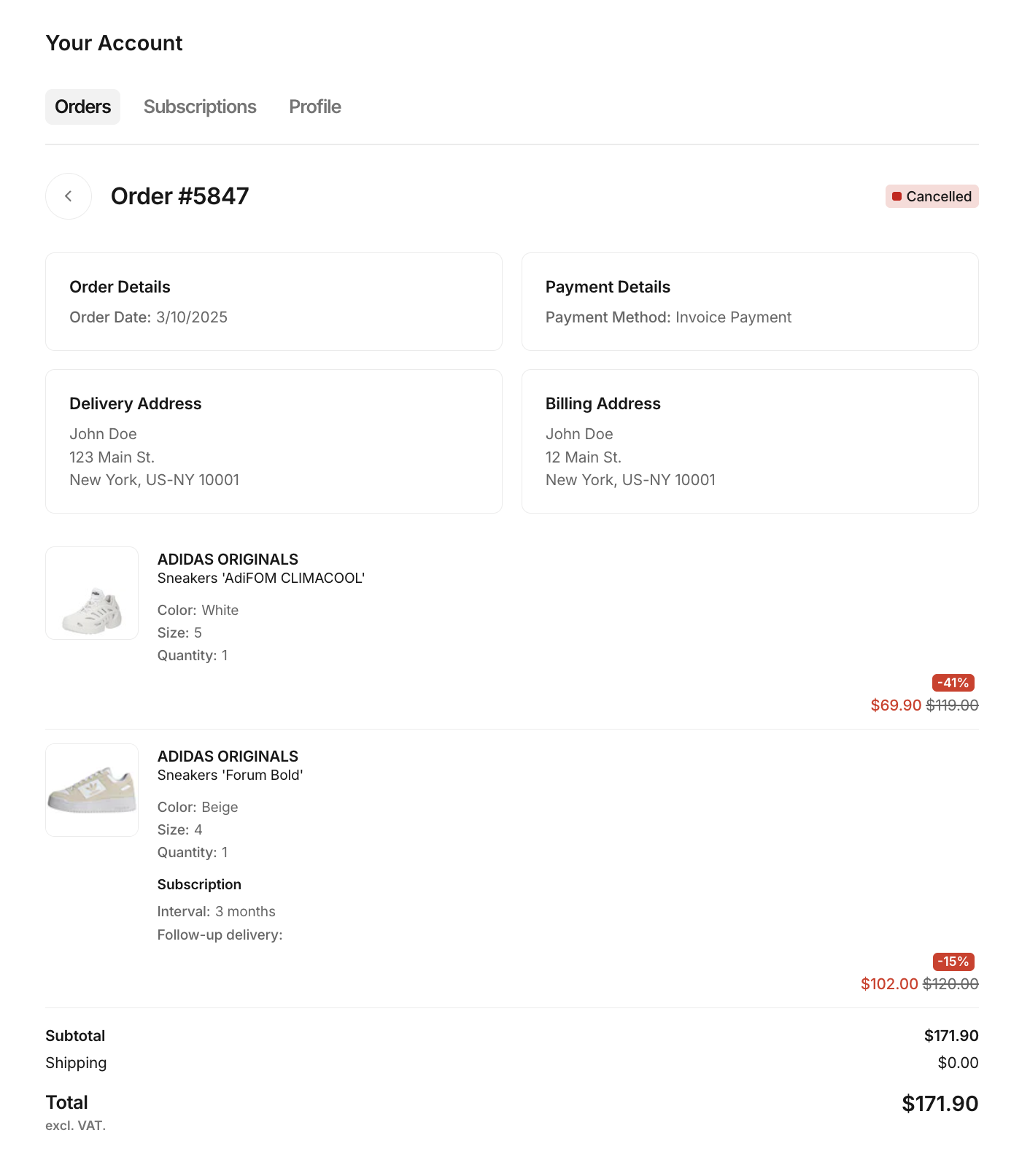 - Account Navigation – Provides a structured layout with clear tabs for Orders, Subscriptions, and Profile.