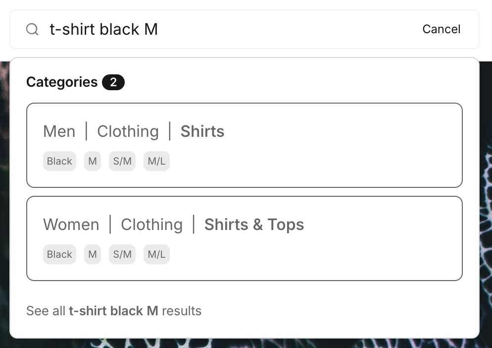 Shirtcategory. - Category (with filters) – e.g., typing "shirt black M" suggests the
