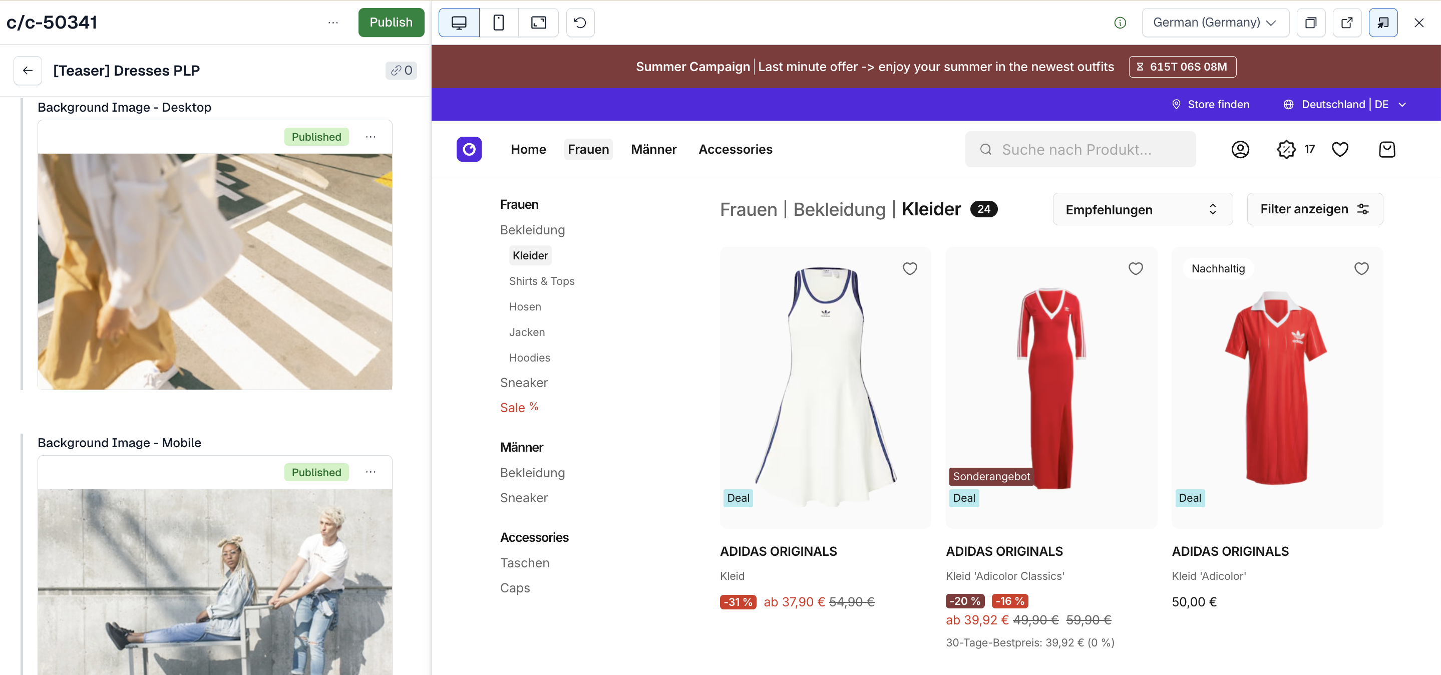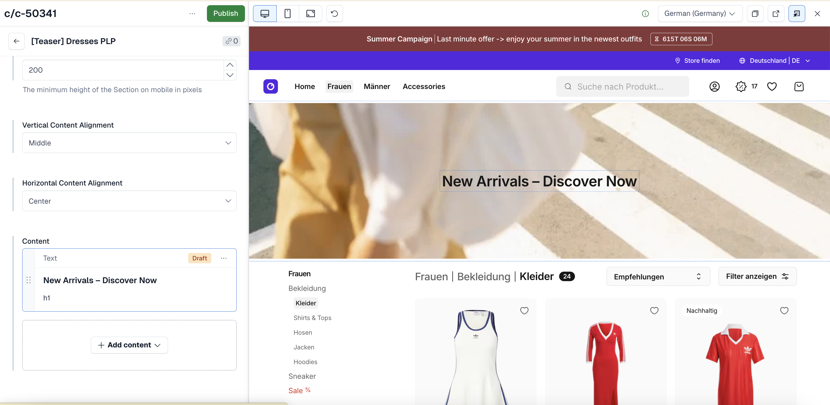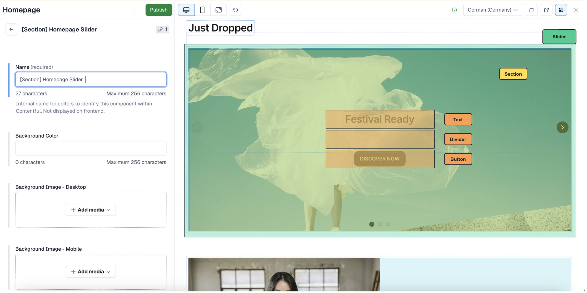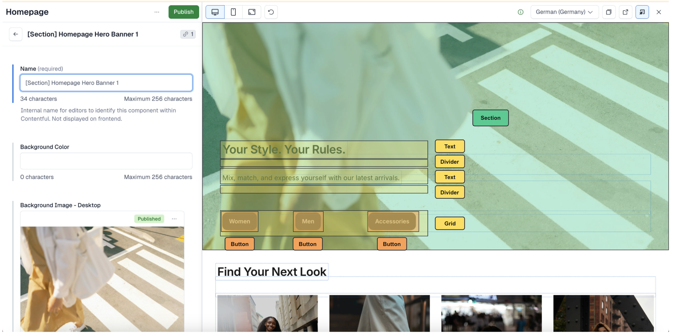 Contentful uses a content-type-based architecture where content is built from flexible, reusable content blocks. Each Contentful content type maps to a Vue component in your application, enabling a seamless bridge between your CMS and Storefront.