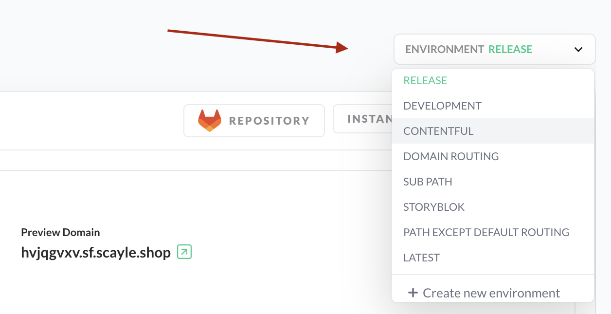 Environments are crucial to test different features and aspects of your Storefront Application. Use the "Environments" dropdown to check the list of currently available environments and create new ones. Keep in mind that as part of the initial Git repository setup, SCAYLE will always create one pre-defined environment for you. The value of the pre-generated environment key of that environment is main .