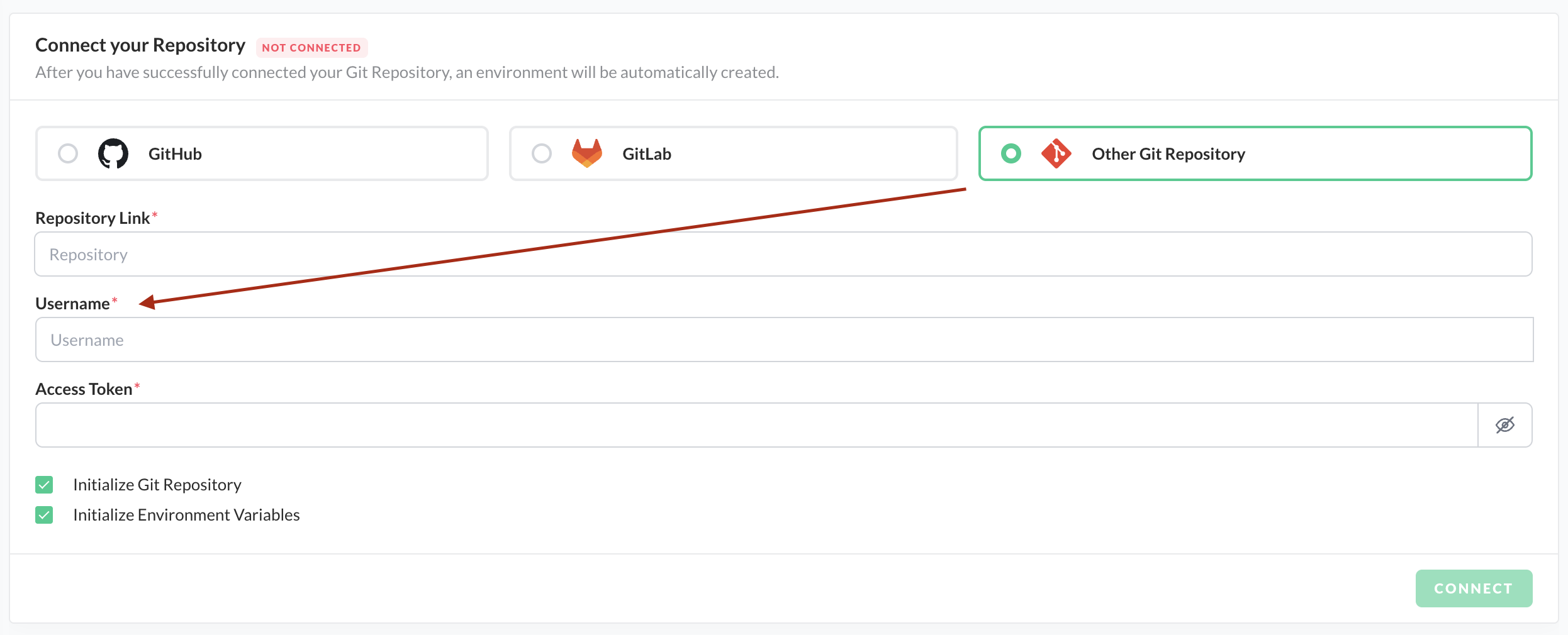 - In case you are not using either GitHub or GitLab, you can choose a 3rd option, Other Git Repository, which generically supports other Git providers like Bitbucket.