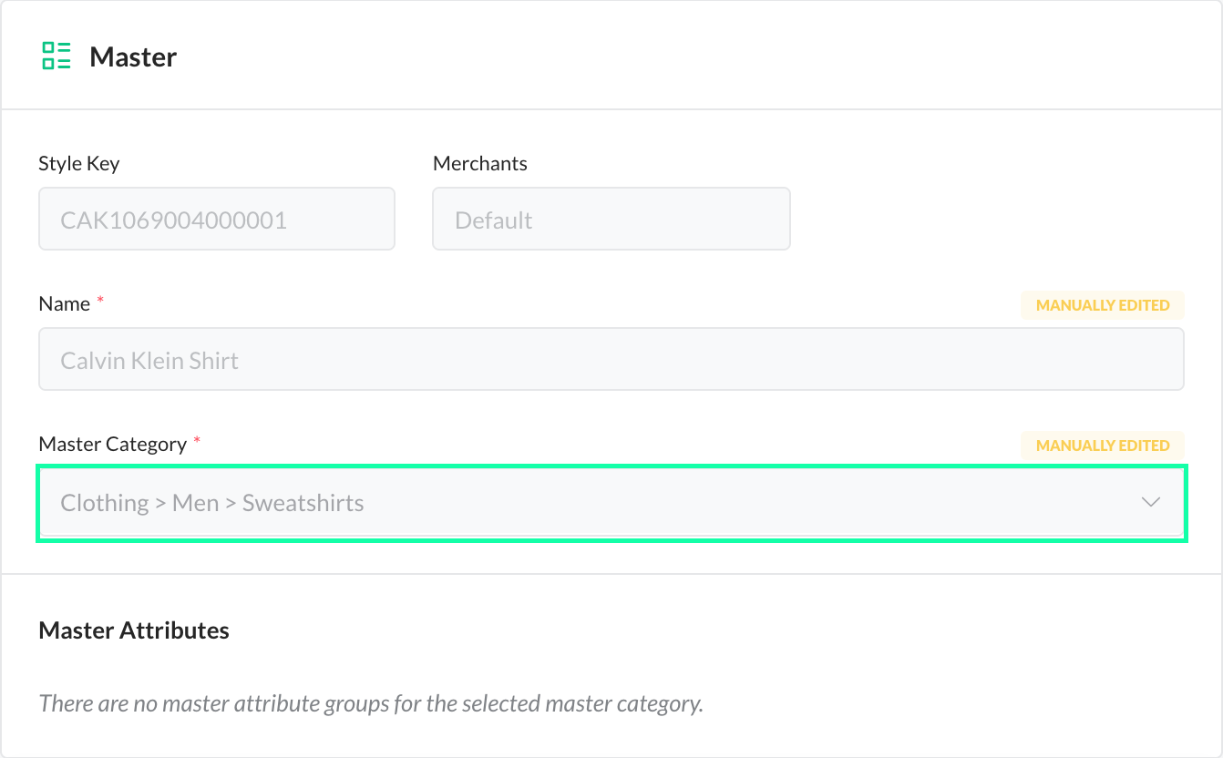 In the Master area, you can see all Attribute Groups previously assigned to the master entity. In the following example, the product was assigned to the Master Category "Sweatshirts".