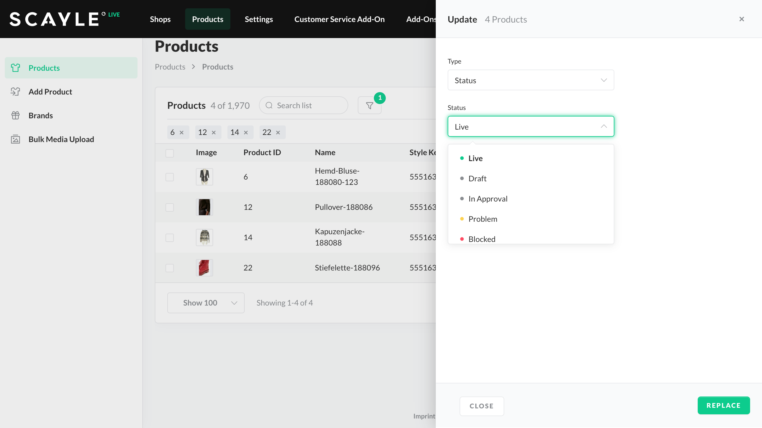 | Draft | Products with live or blocked status will not be overridden and should not be in the product selection. | Products with the status Problem can be updated as a draft. |