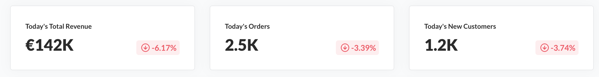 Each KPI displays the percentage change by comparing today’s value to the corresponding value from the same time period on the previous day.