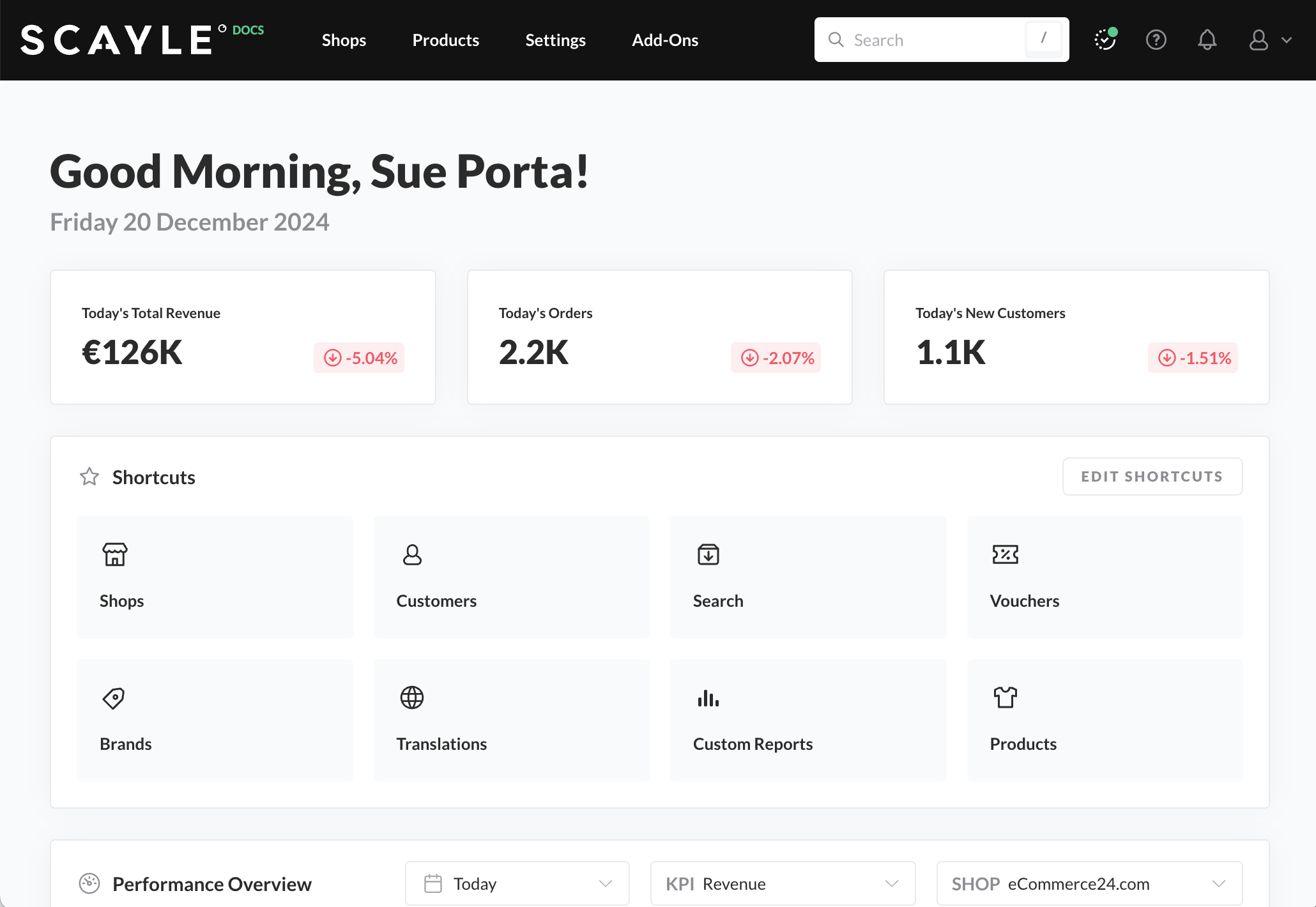 Users with the shop__kpi__show permission see the Performance Overview. This feature allows them to view the performance of their shop countries based on a selectable KPI, shop, and timeframe.