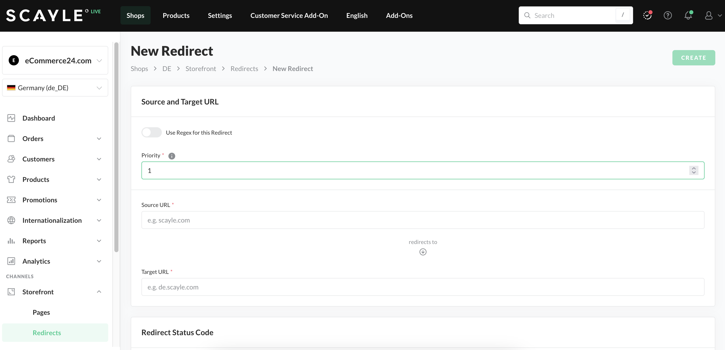 - In the SCAYLE Panel, go to Shops ➜ [Shop] ➜ Storefront ➜ Redirects.