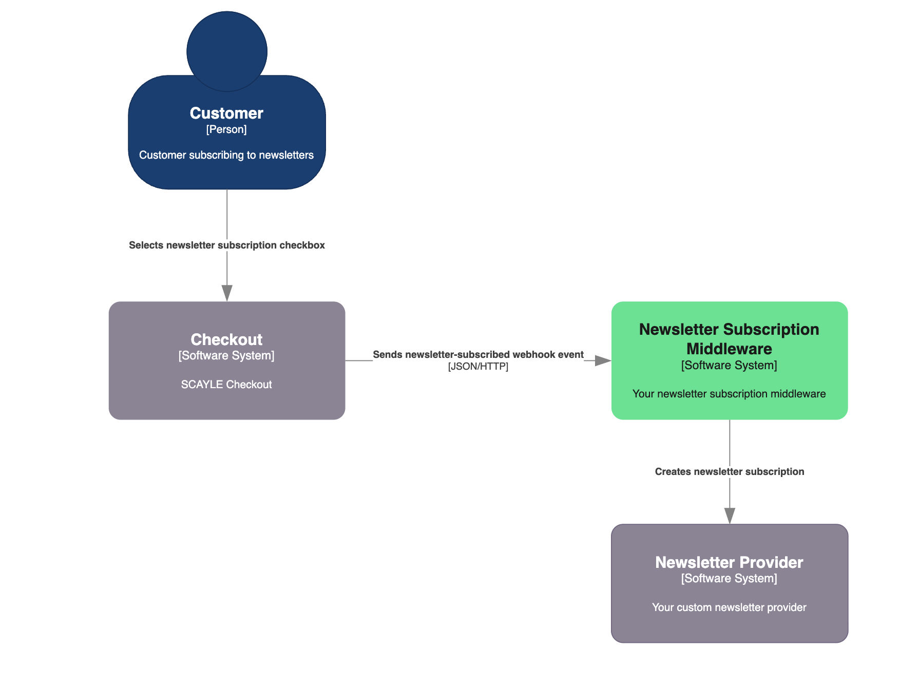 We suggest to keep your newsletter subscription service stateless, following a simple ‘Gateway’ pattern that forwards newsletter subscriptions from SCAYLE to your preferred newsletter provider. By keeping your service stateless, you do not need to persist personal data.
