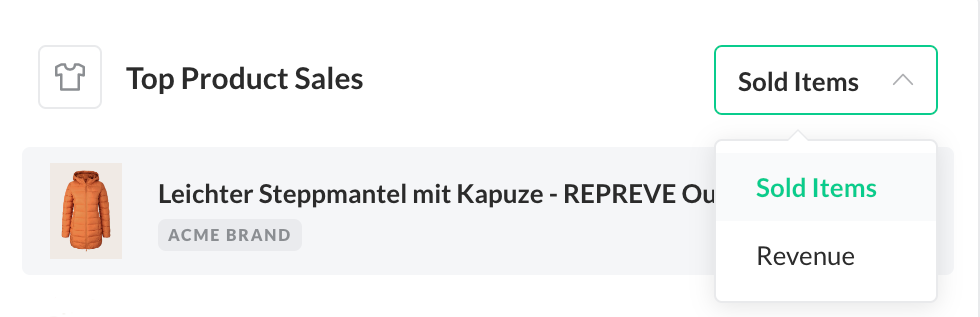 | Top Brands (by no. of sold items) | ✓ | ✓ | Top 5 brands by number of items sold in the given time frame. |