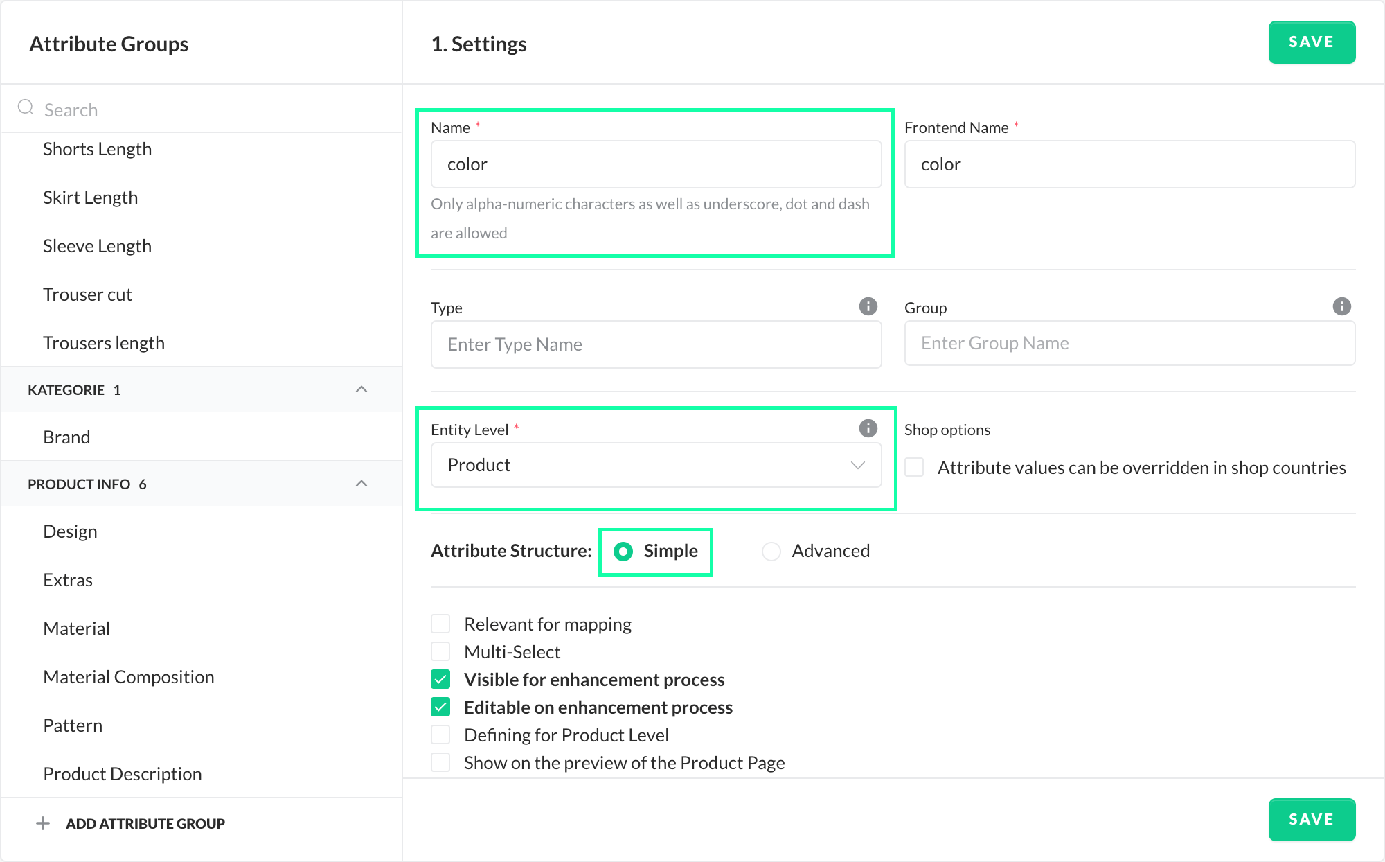 To decide which type of attribute group to use, consider if the information is reusable. Only free text descriptions or product-specific information (like EANs) should be advanced attribute groups. All product information can usually be listed in simple attribute groups. Please try to mostly use simple attribute groups to reduce database complexity.