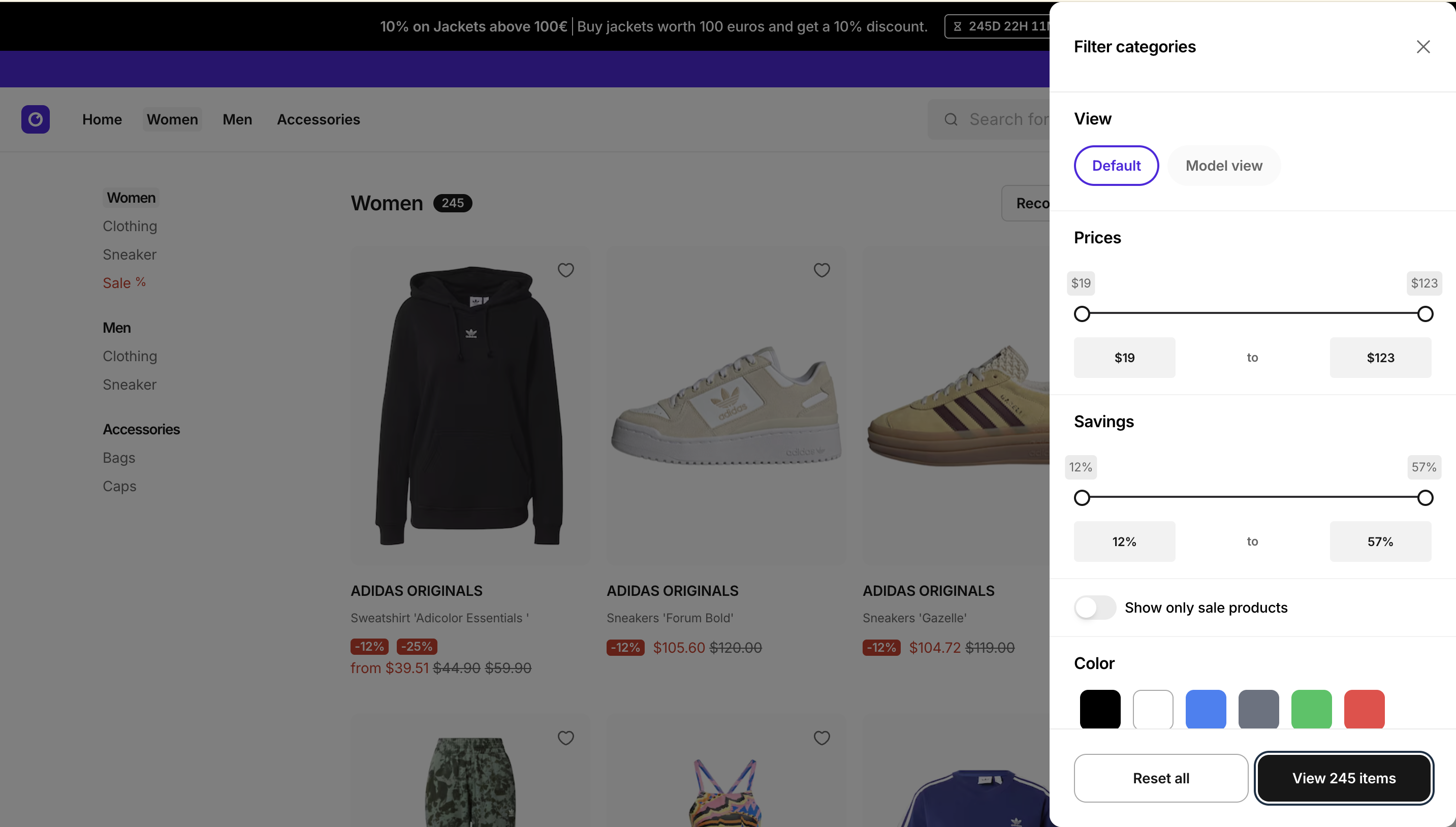 - Filtering and View: Allows users to filter products based on various criteria (e.g., price, brand and size) and switch the primary product image (e.g., "model view" vs. "product view").