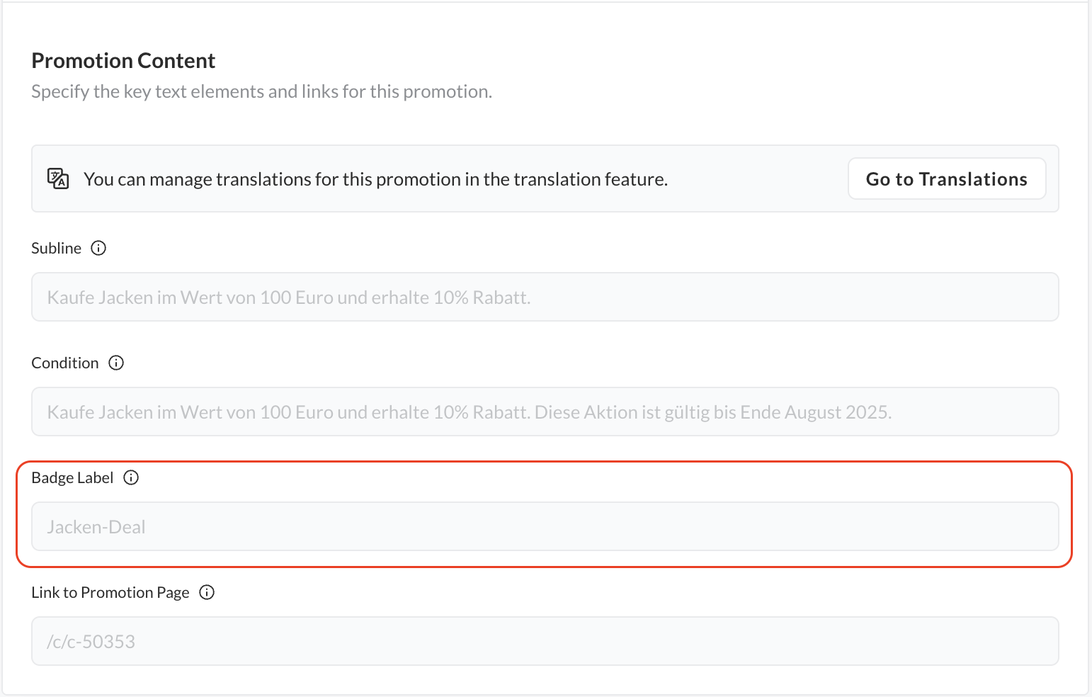 If a deal (promotion or campaign) is set for multiple countries, a translation box will appear above the translatable fields (e.g., subline
