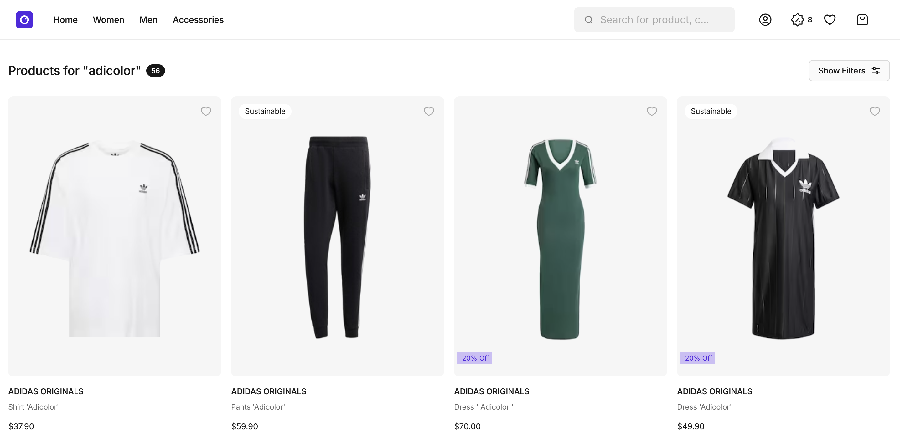 - If no exact match is found, a search result page is displayed, featuring a range of products related to the term. \
