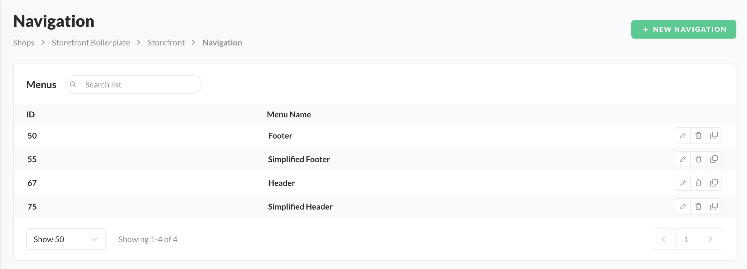 For our Storefront Application, we’ve configured four separate navigation menus: