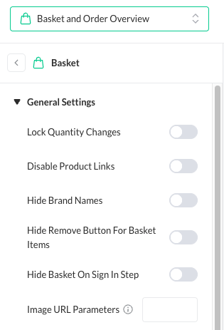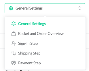 - High‑level settings selector – switch between areas: General Settings, Basket, Payment Step, Sign In Step and Delivery Step.
