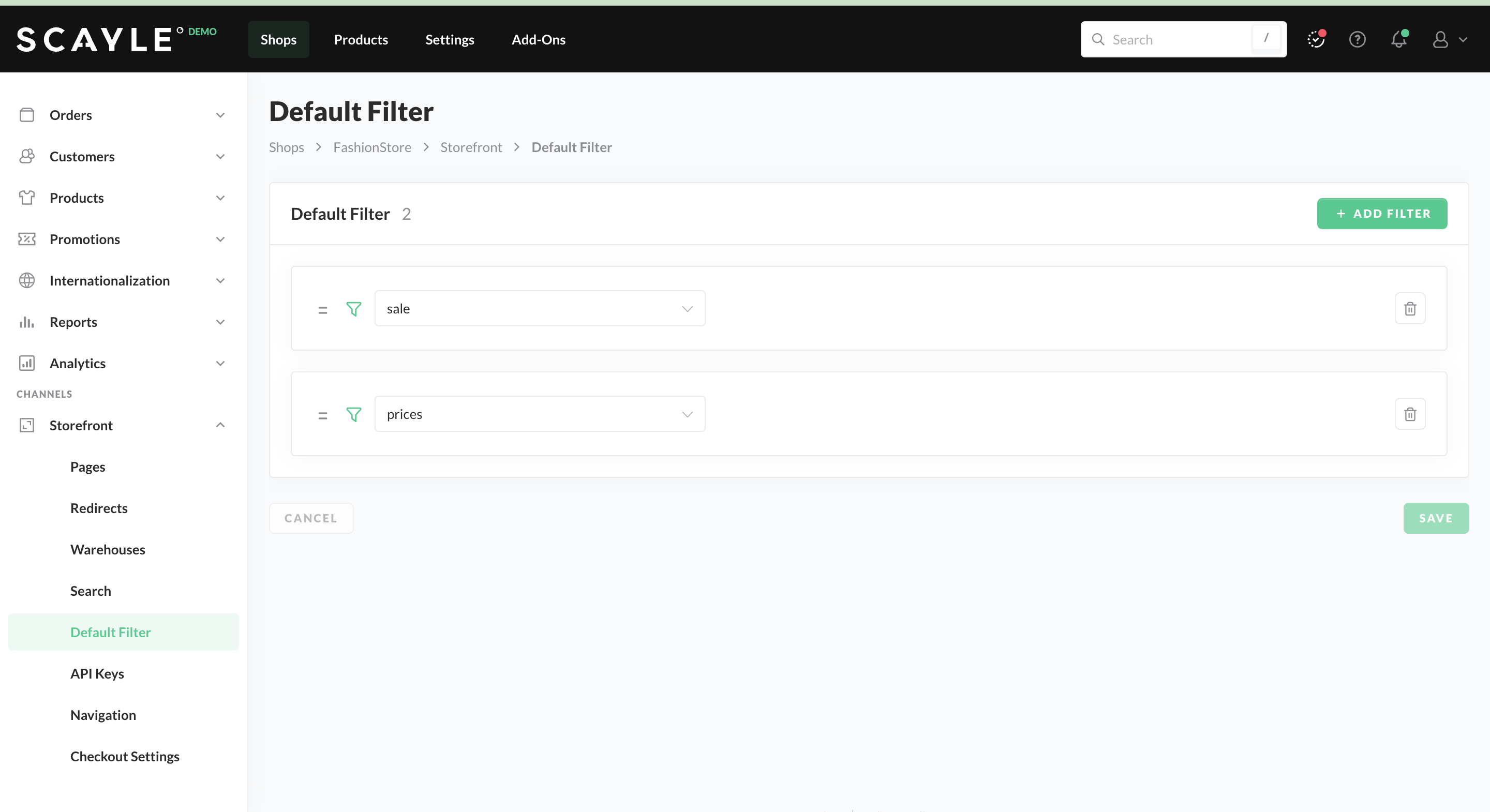 The Sale filter will filter for products in sale or in a campaign. The Sale filter (toggle) is part of the SCAYLE standard filters, you can select it for your shop under Shops ➜ Storefront ➜ Default Filter and it will be exposed via Storefront API filters endpoint.