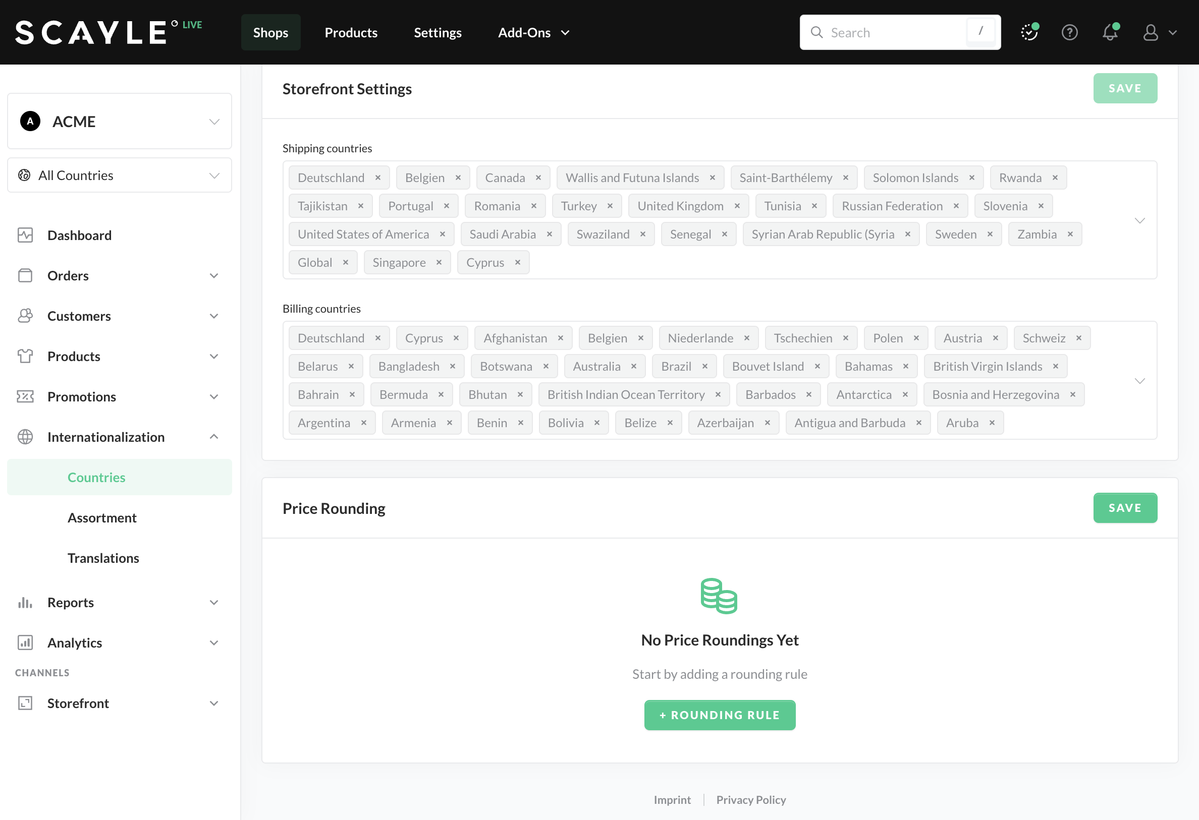Under Storefront Settings you can define the allowed Shipment and Billing Countries for your Checkout System.