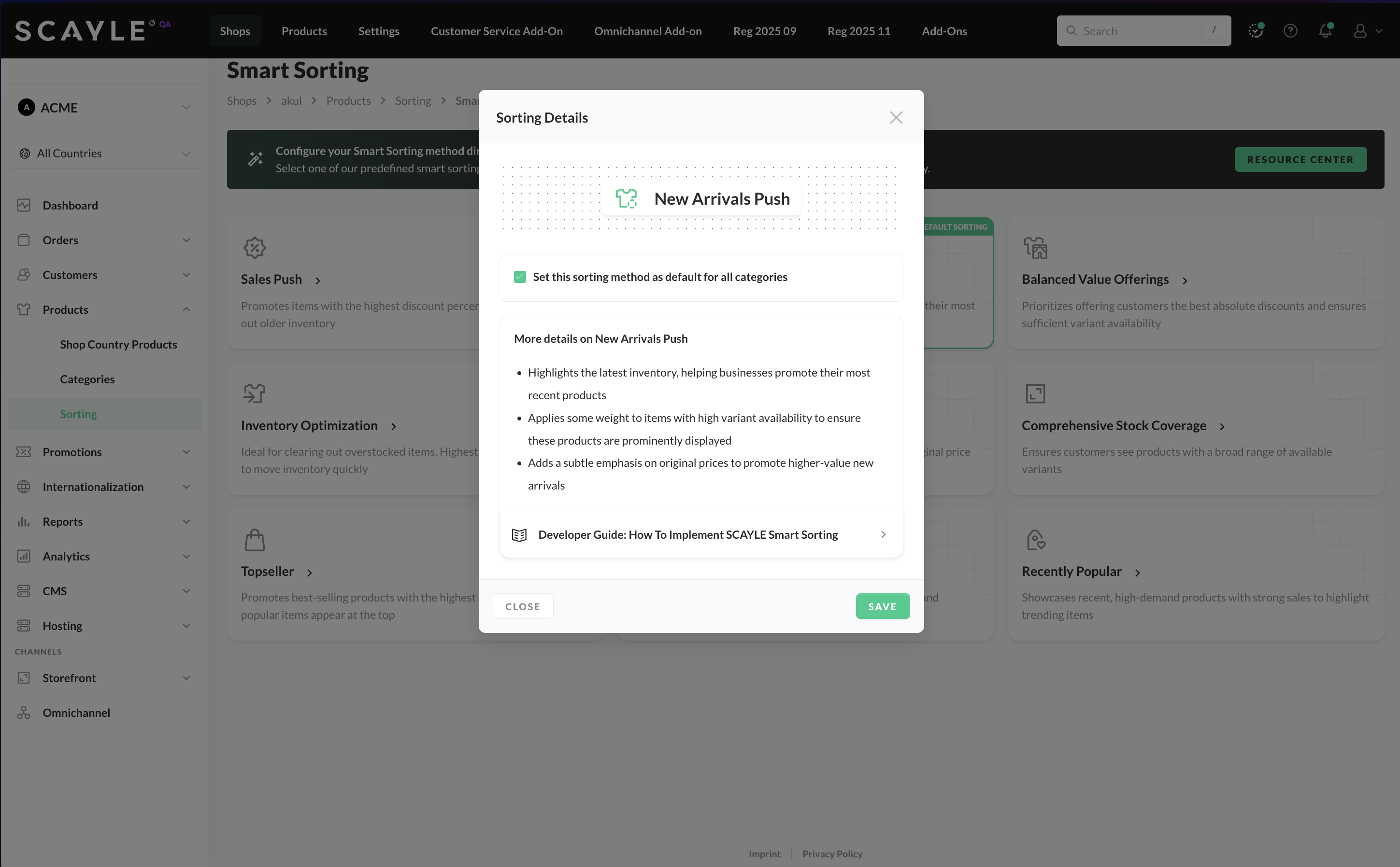 you can define a default smart sorting on global shop level, which will apply to all categories in all countries of the respective shop. You can also define a default smart sorting on country shop level, which will override default sorting configurations on global shop level and will only apply to the respective shop country.