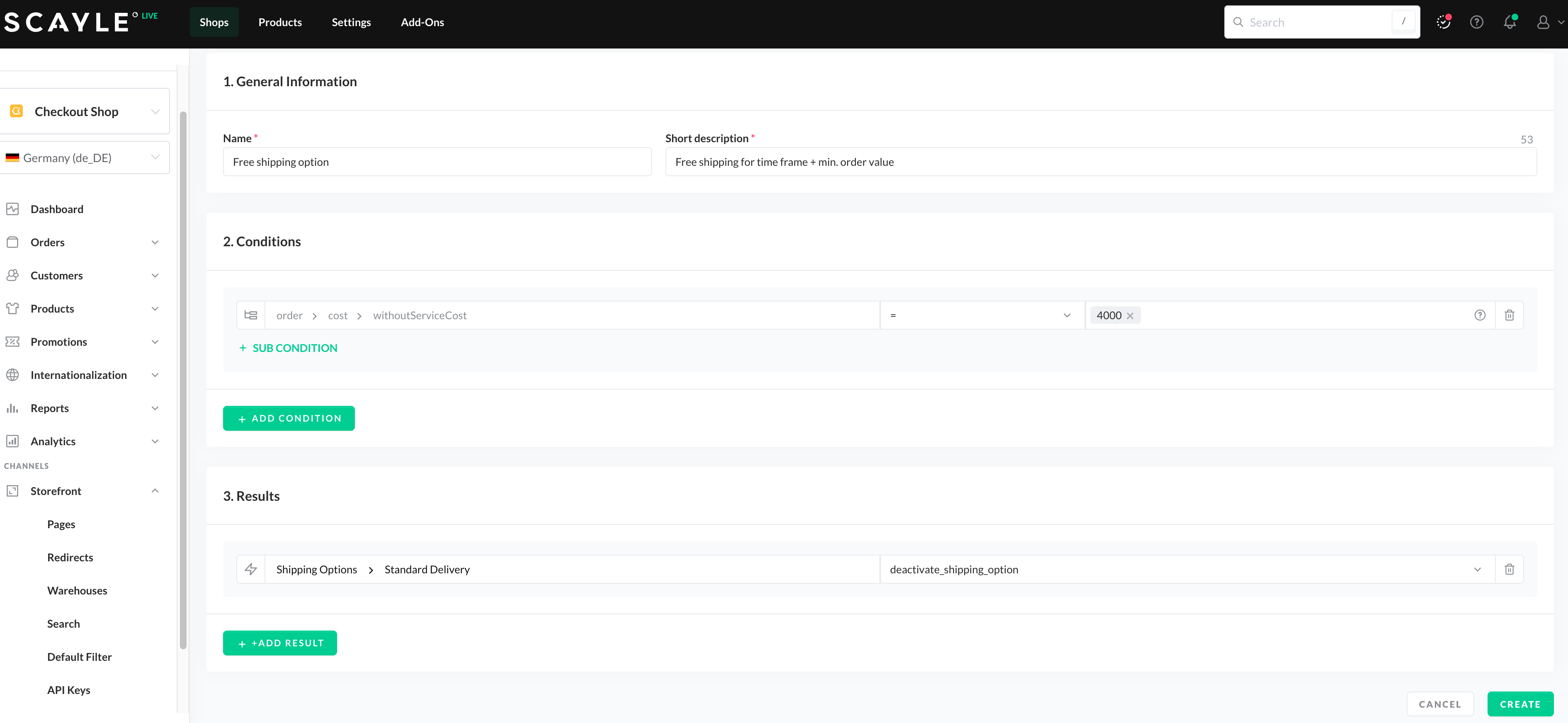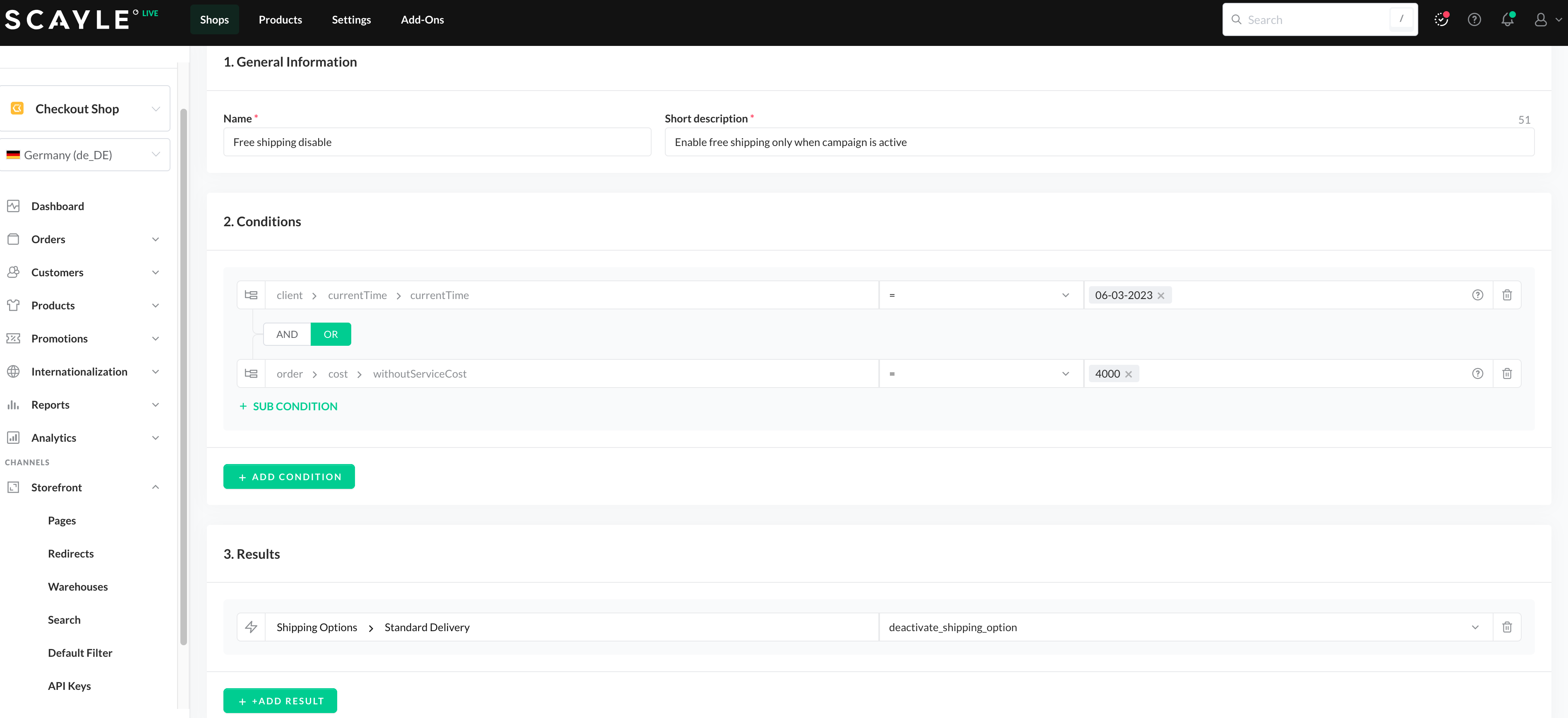 Scenario: Set free shipping for all women living in Berlin or Hamburg for orders from the 7th of March until the 9th of March.