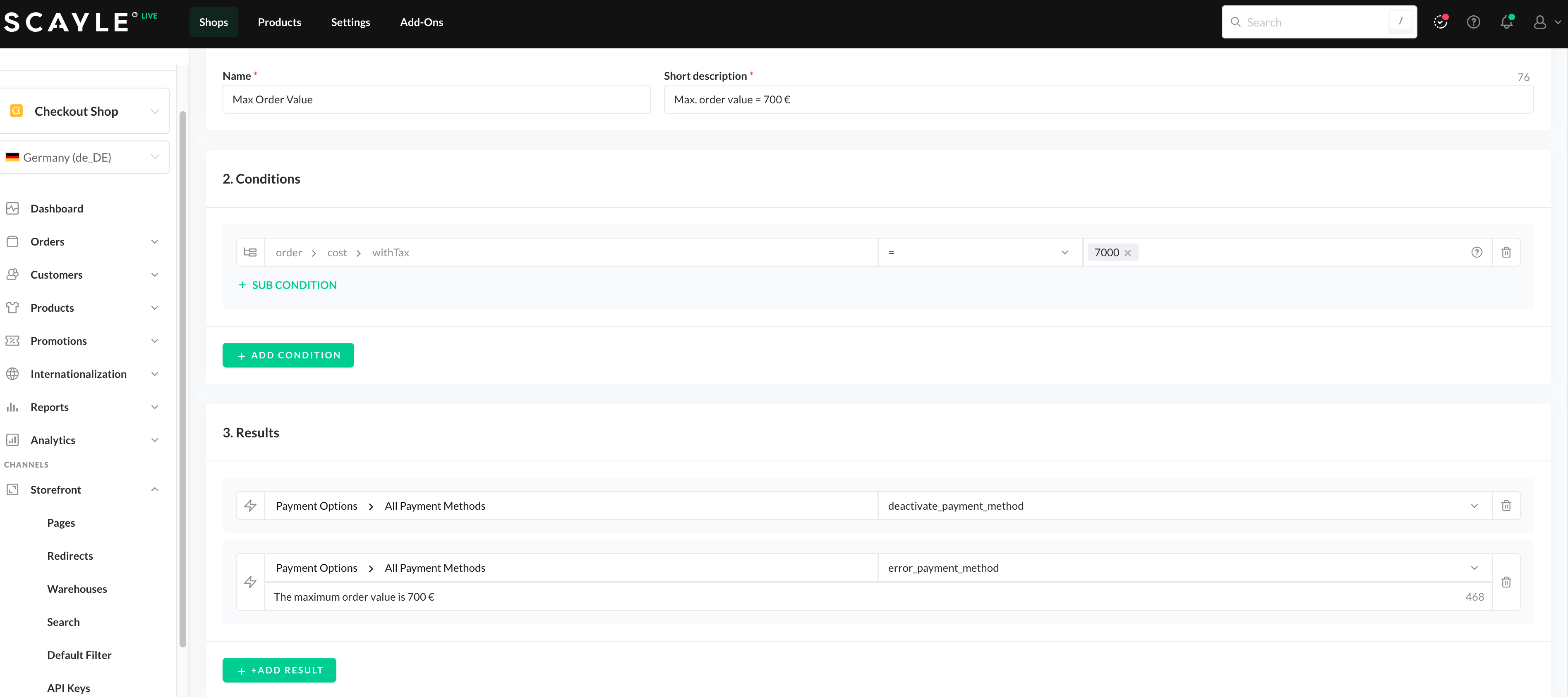 - Results: Select one or more results to trigger if the conditions are met (e.g., Payment Options ➜ All Payment Methods ➜ Deactivate Payment Method).